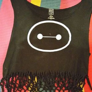 This top has been CUT and RESHAPED! BEWARE may be uneven! Fits true to size, fits medium just fine. Will show stomach. Black top with white outline of face of character Baymax from the cartoon "Big Hero 6".