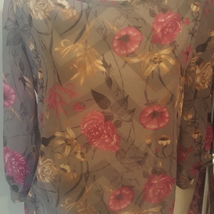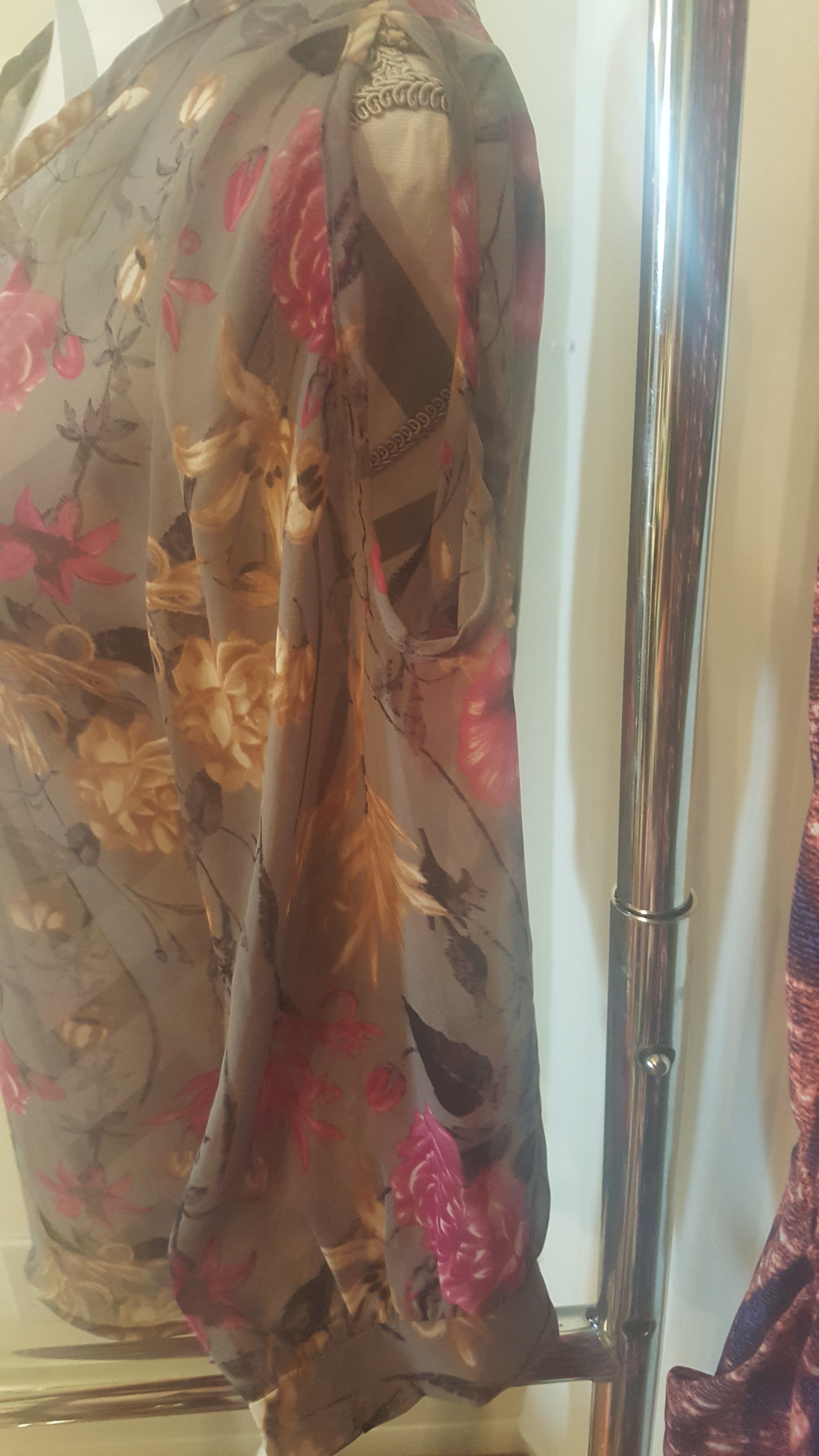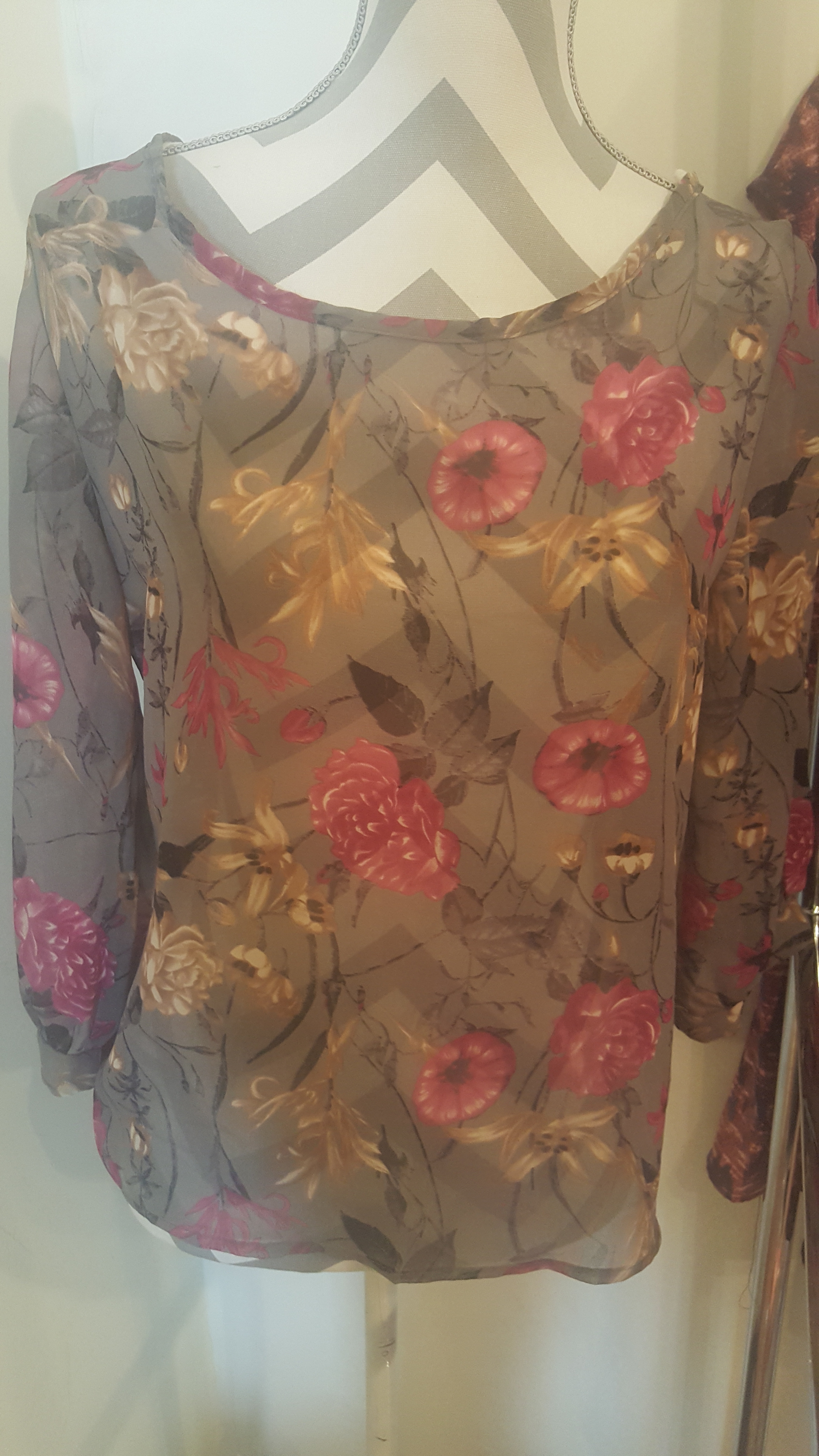 Beautiful floral sheer blouse with slits on sleeves. Perfect for any season.