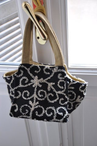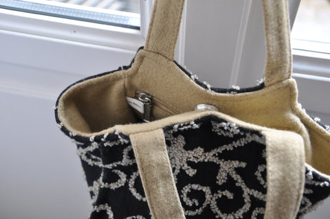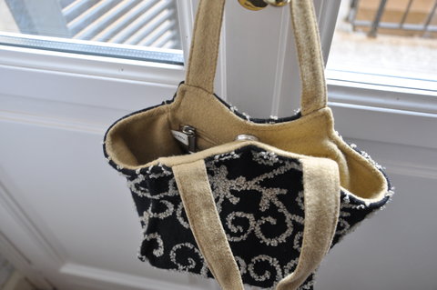 Original hand-bag in black with hand knitted decorations in light brown. Very small and cosy.