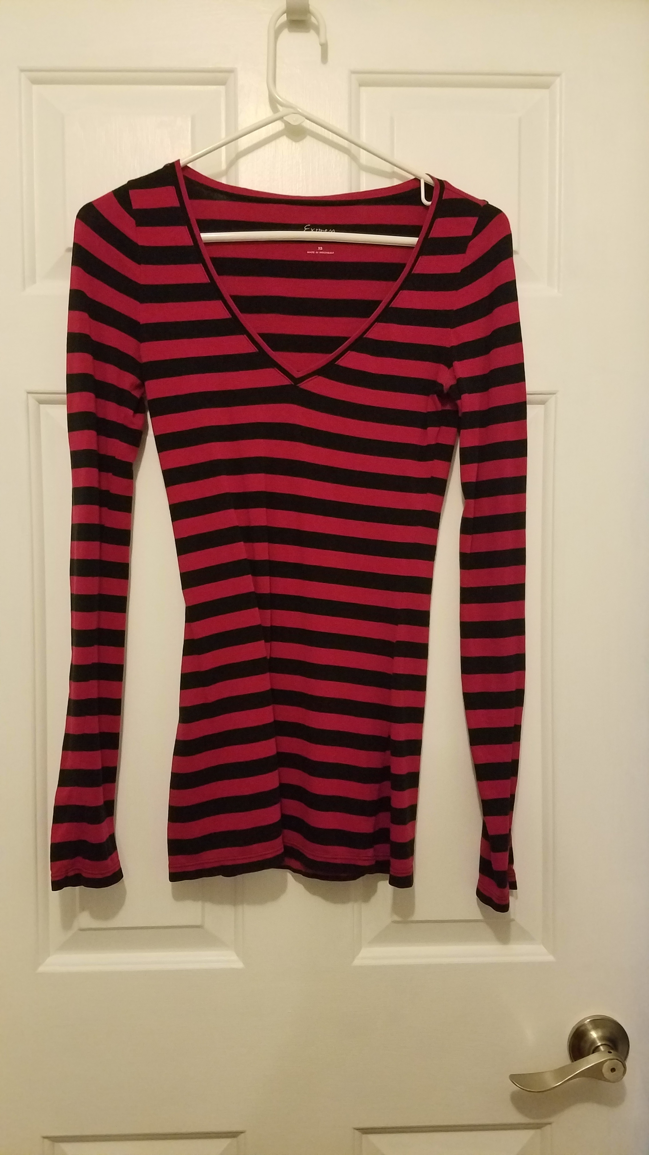 Hott pink and black striped v-neck tunic. It's much more of a pink/raspberry color, not as red as it looks in the pic.