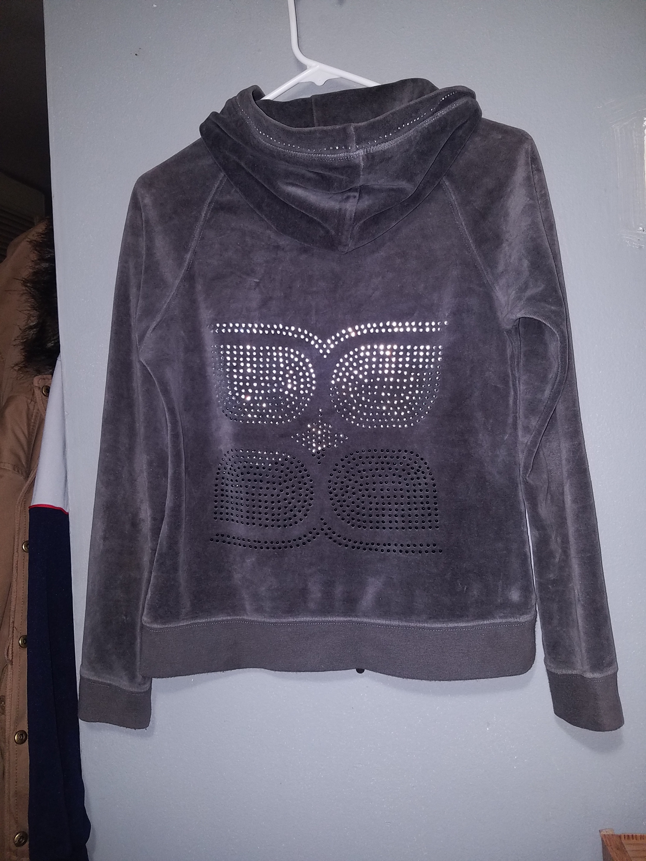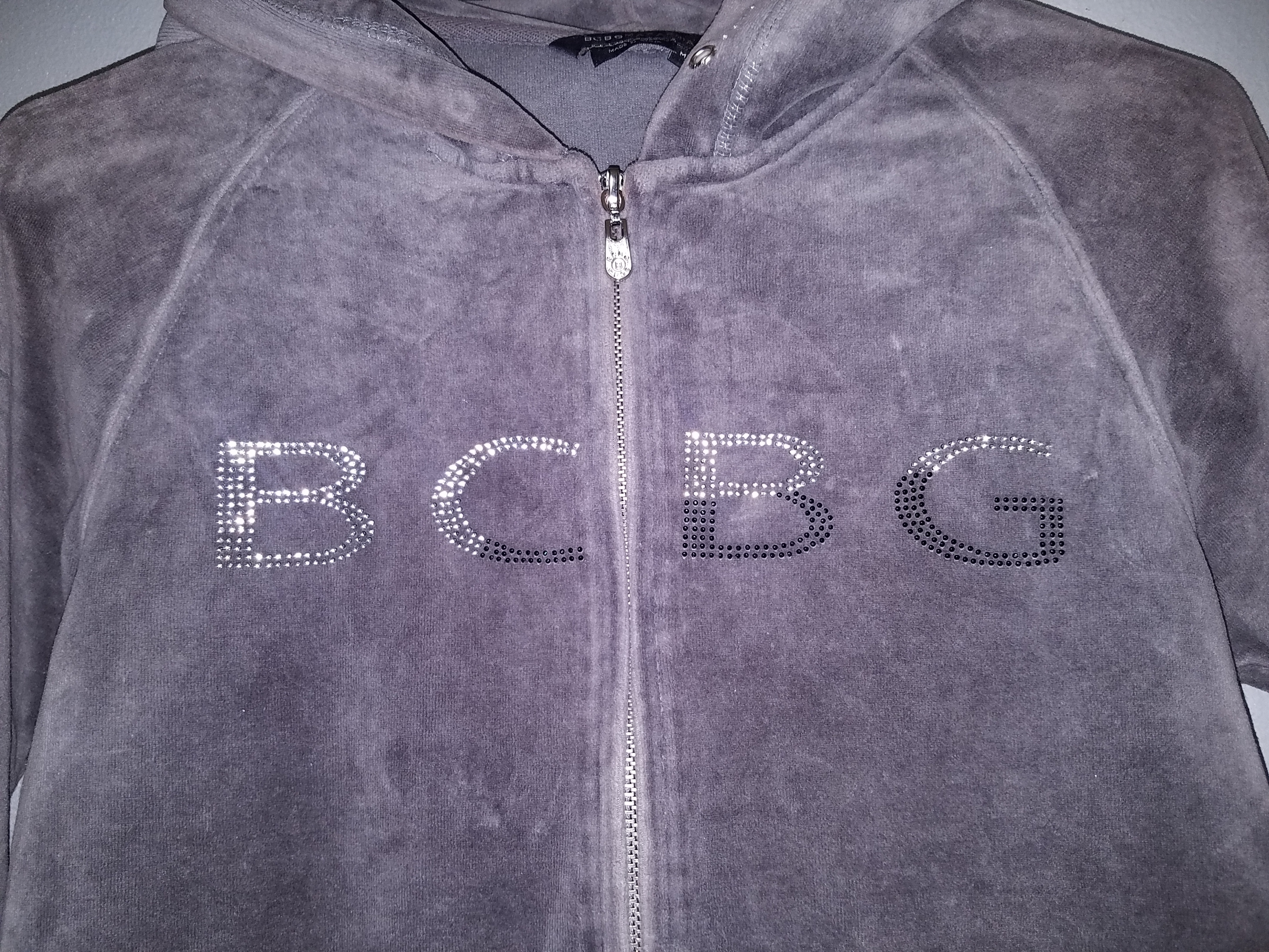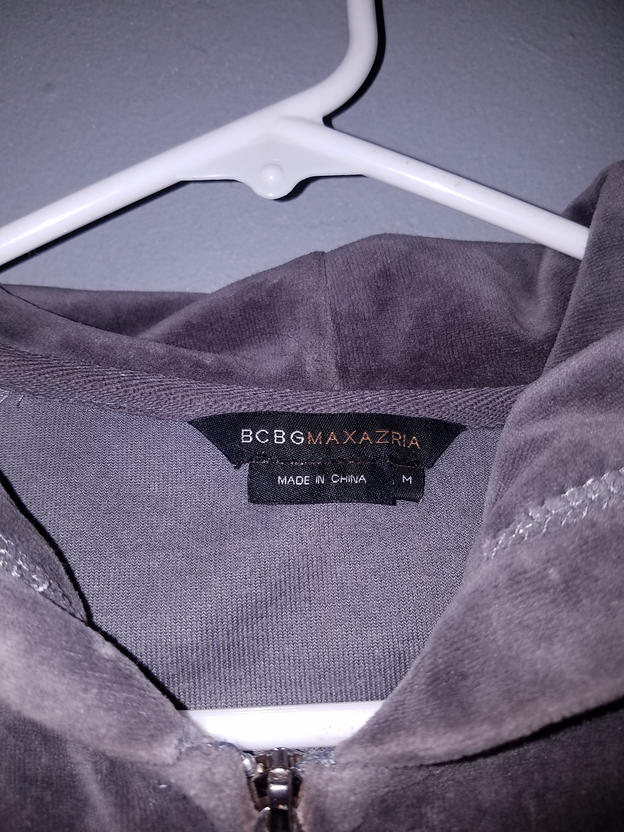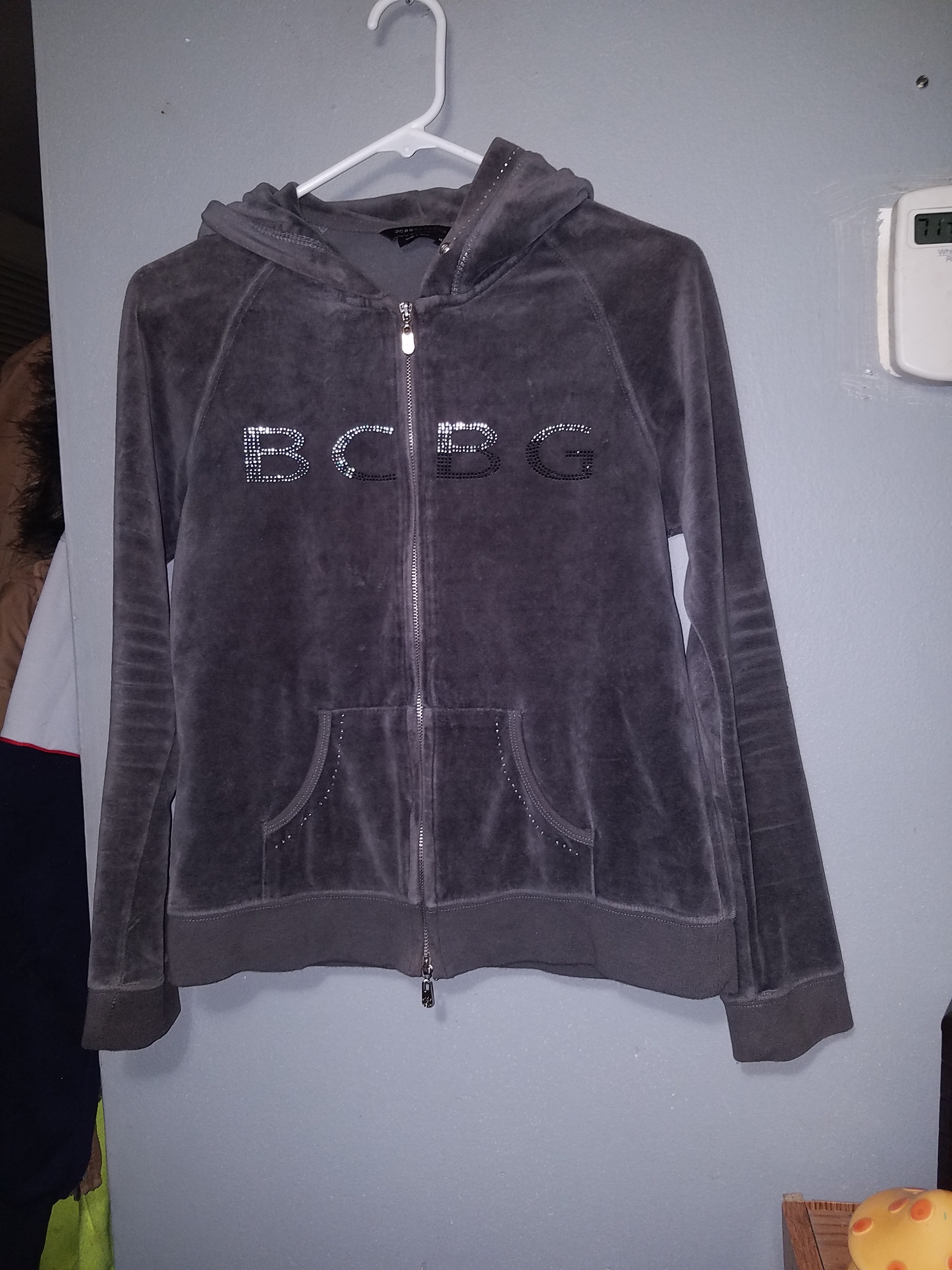 This is a grey velour BCBG hoodie.. the tag says M but it can fit a small. Armpit to armpit 18" - - Shoulder to hem 23"
