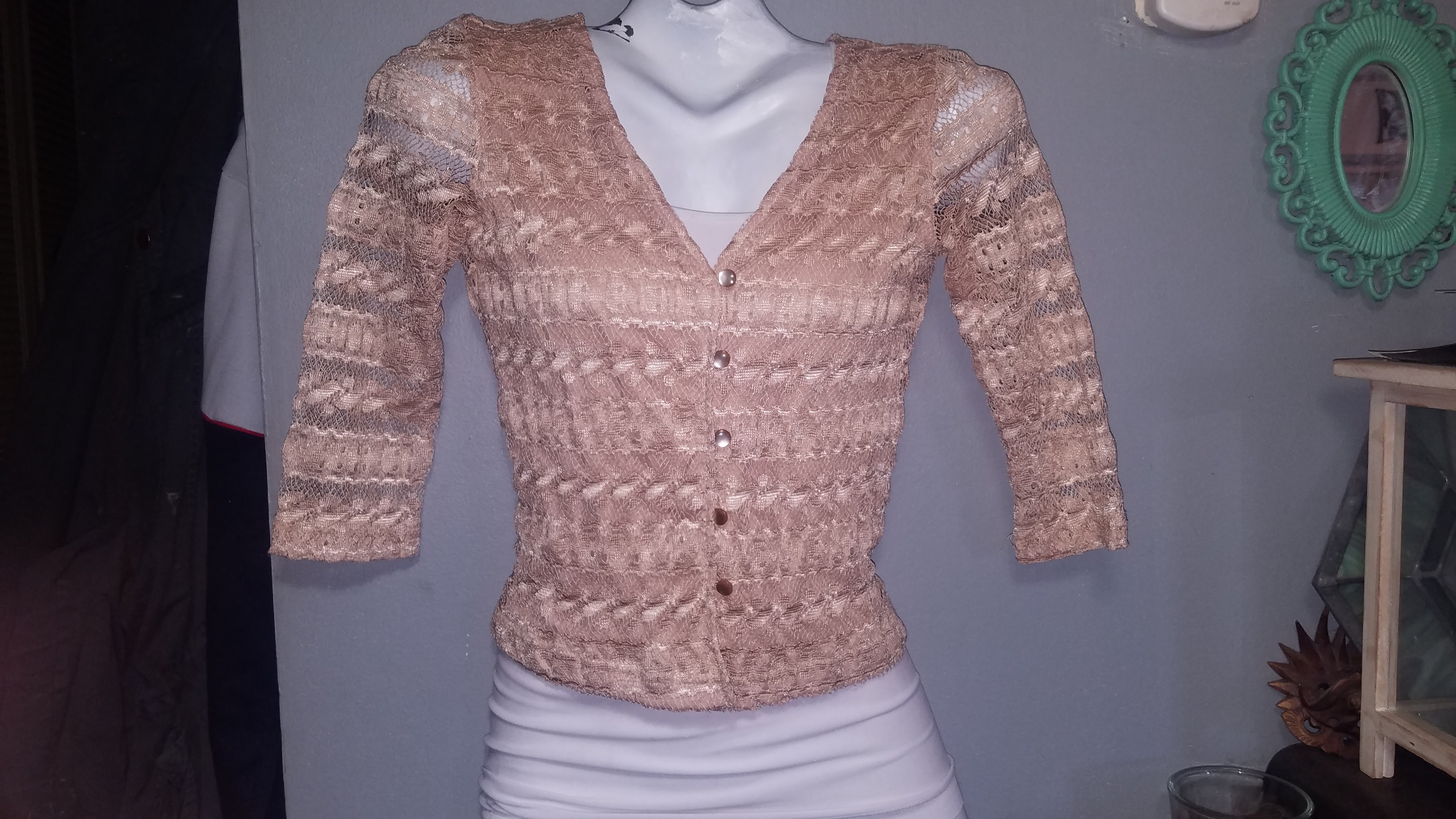 This is a nude colored lace cardigan from the 90s. The brand is 'EXLPOSION' But I don't think that company doesn't even exist anymore... measurements are taken while item is flat - Armpit to armpit. 17.5" - Shoulder to hem 20"