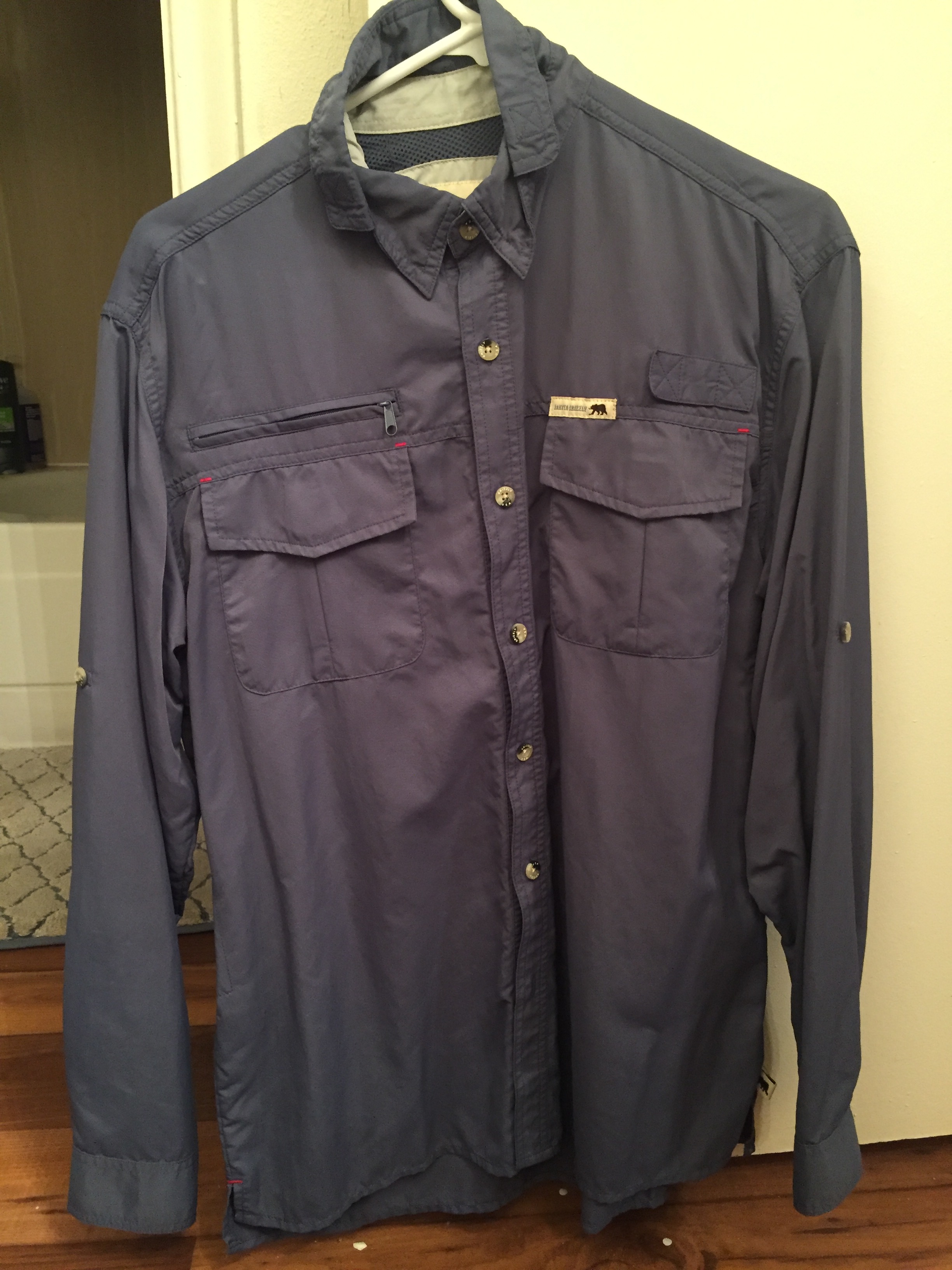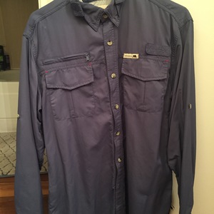 Practically new blue Dakota Grizzly 100% nylon longsleeve outdoor shirt. Includes multiple pockets and a button and strap to hold rolled up sleeves.