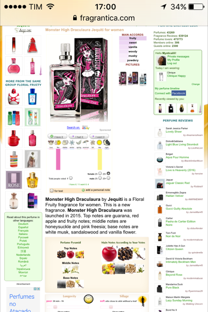 Monster High Draculaura by Jequiti is a Floral Fruity fragrance for women. This is a new fragrance. Monster High Draculaura was launched in 2015. Top notes are guarana, red apple and fruity notes; middle notes are honeysuckle and pink freesia; base notes are white musk, sandalowood and vanilla flower. I live in Brazil so you need to be able to trade internationally, ok?
