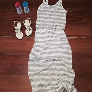 grey/white long dress by Hering. Size M. I live in Brazil so you need to be able to trade internationally, ok?