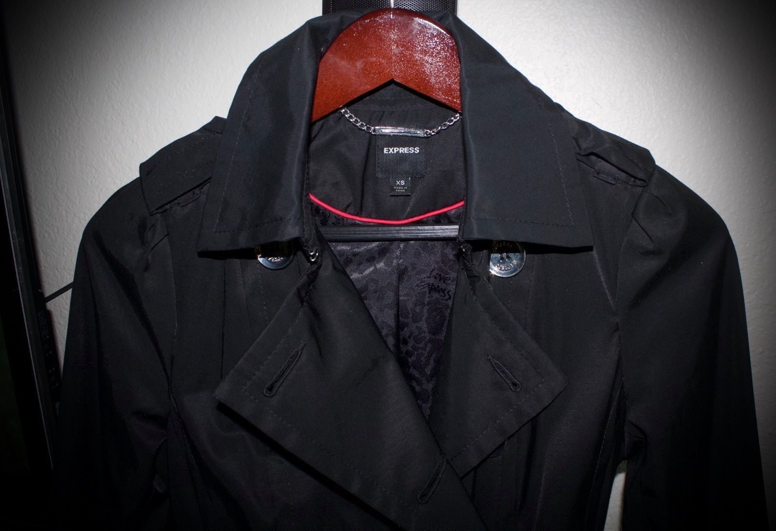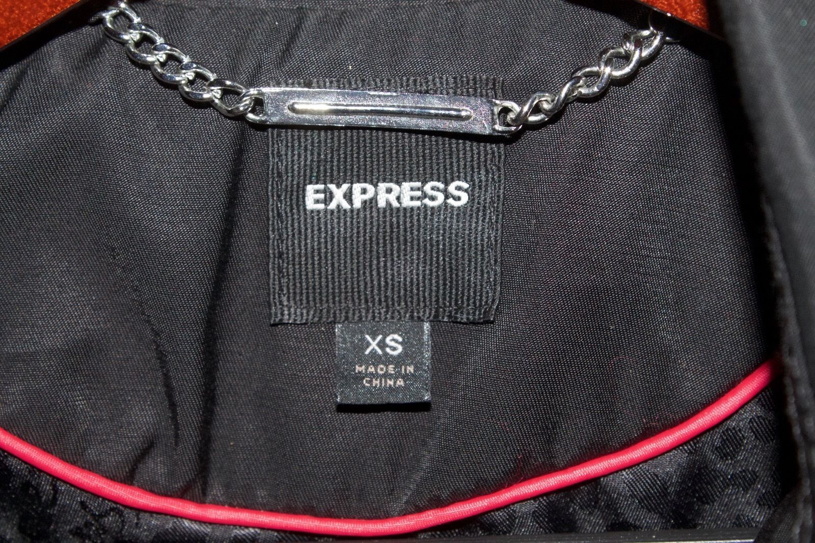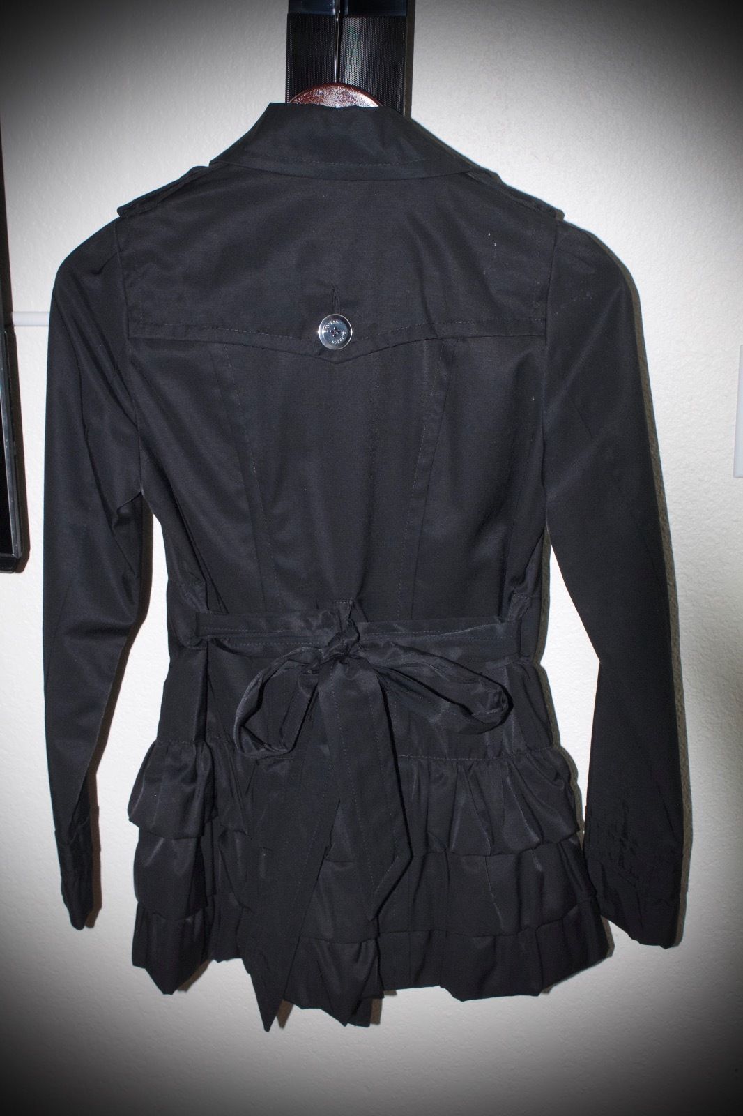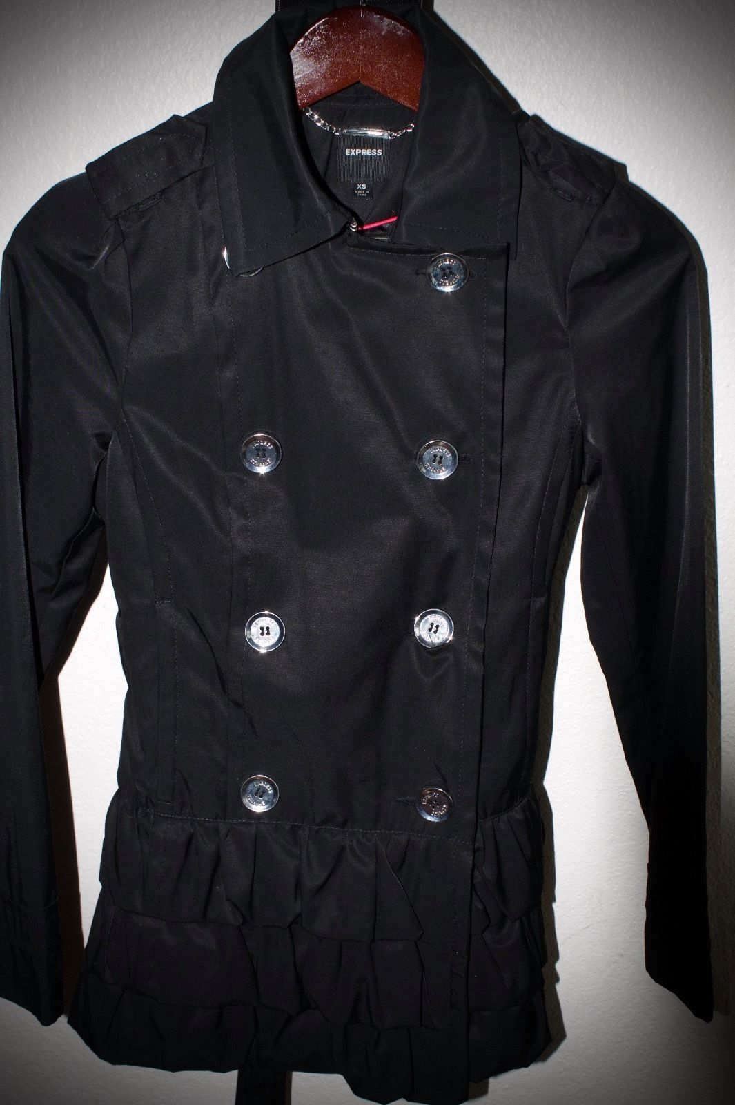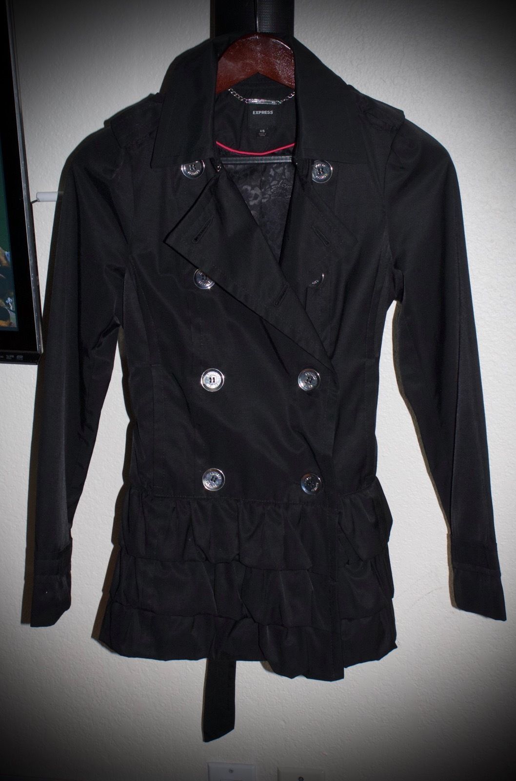 This jacket is super cute but it is small for me. Its new and never been worn. Has beautiful ruffles on the bottom. Has a great belt. Has pockets. Has extra buttons. Also, comes with an Express dustbag that came with a jacket. Measurements: 34"bust and 27"length. The ruffles and belted look together looks very chic and classic!