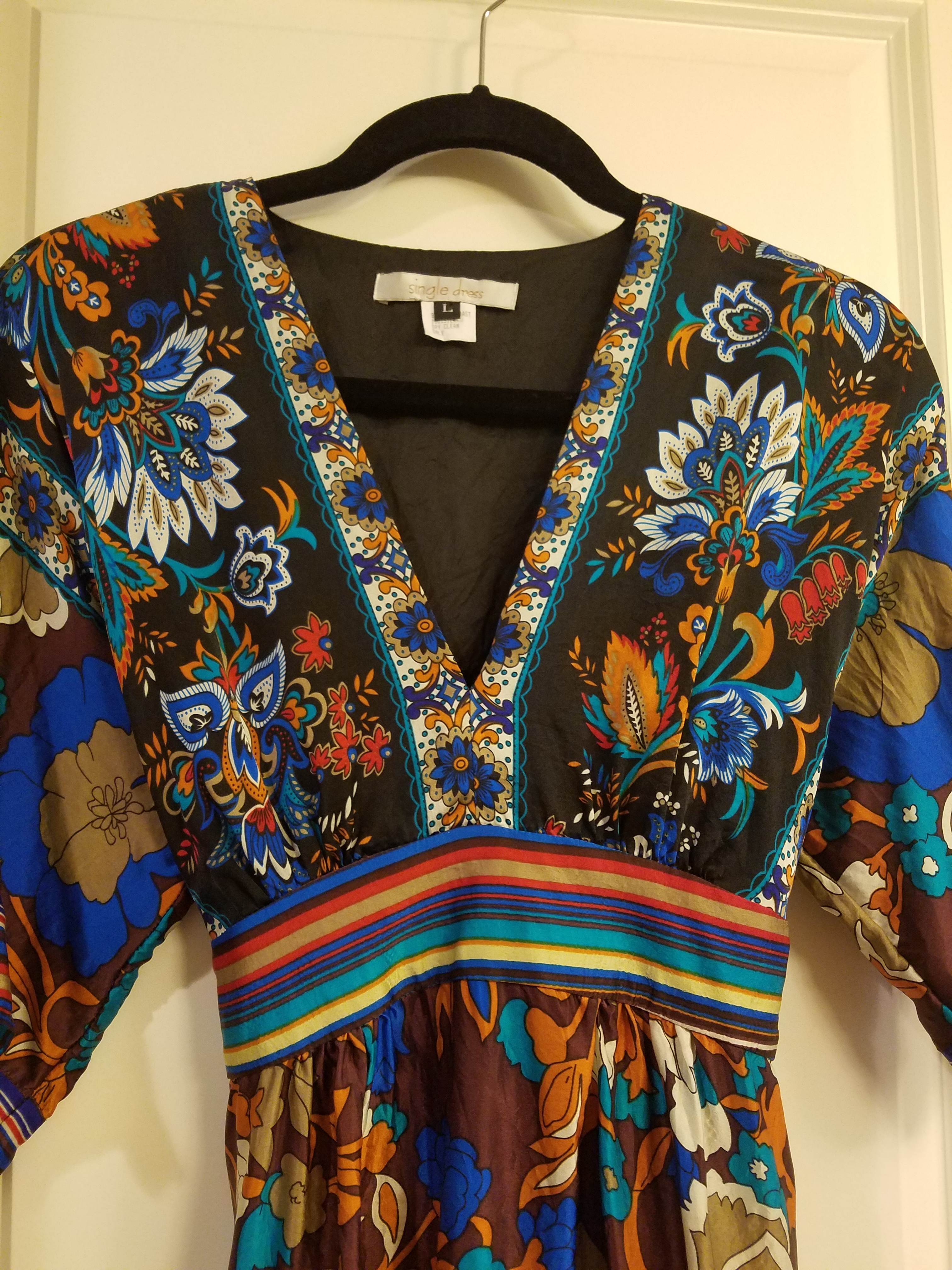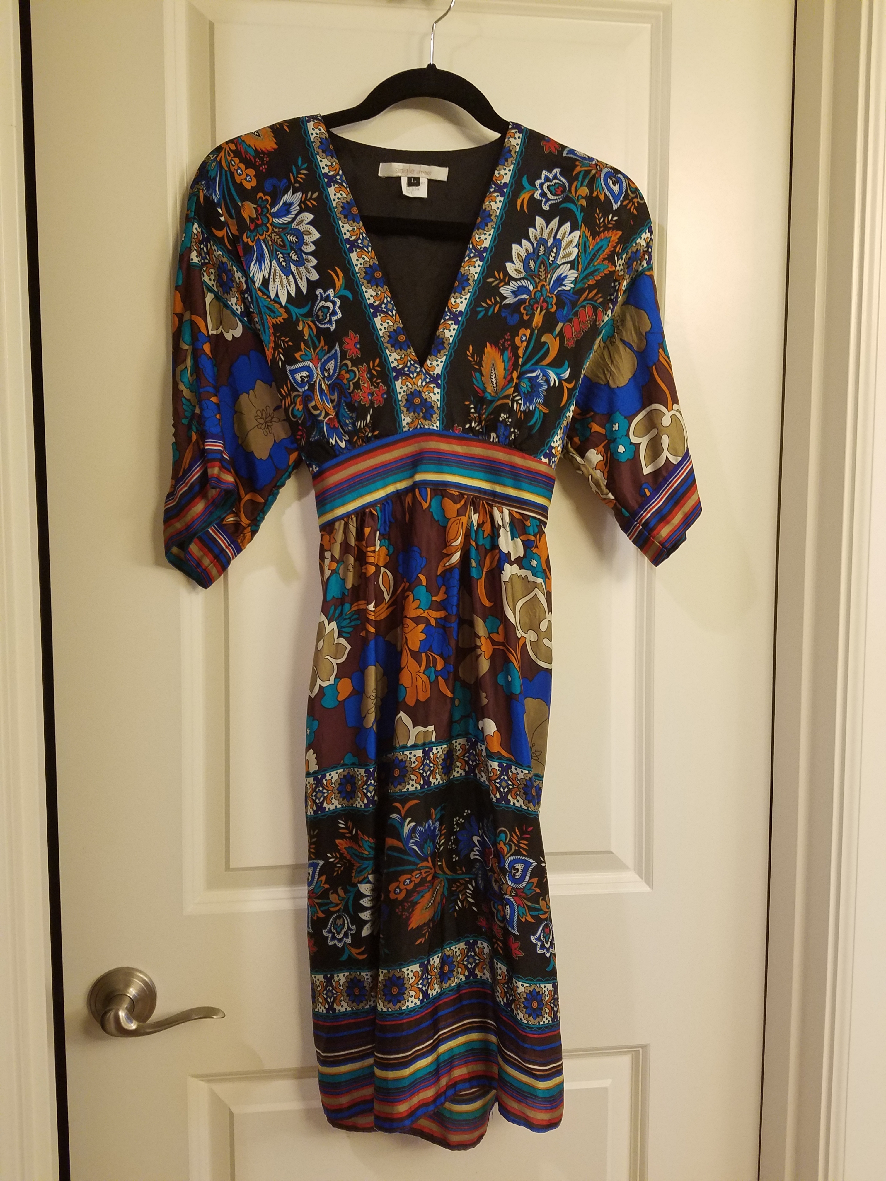 Beautiful silk dress. Size L, i wear S and it fits fine (adjusts we'll for different sizing from bigger small to smaller large).