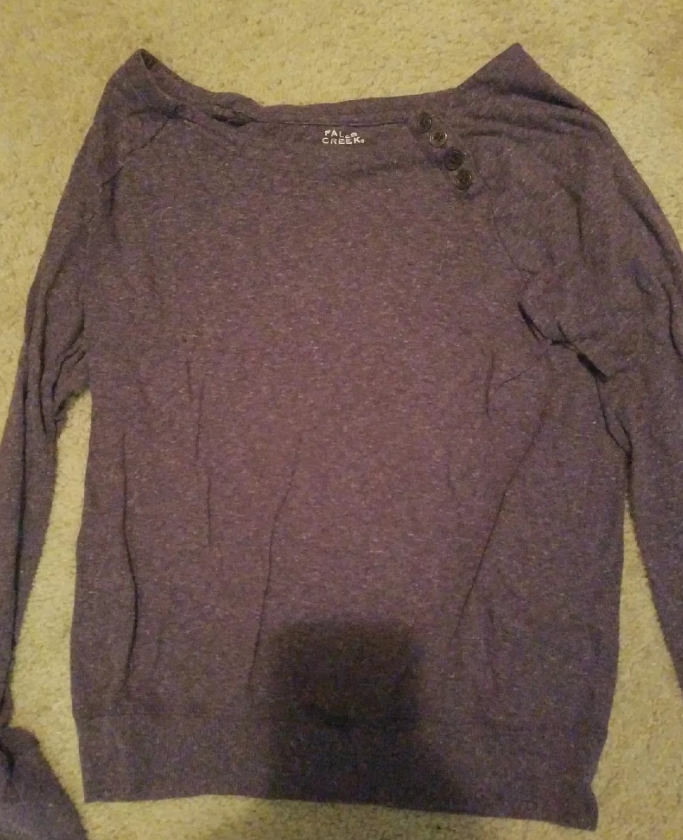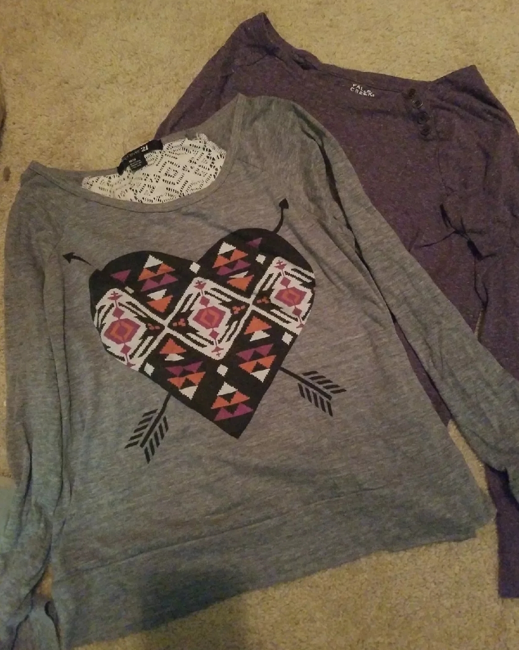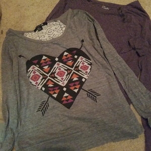 Gray shirt is from forever 21 size medium and purple is from creek falls size small. The gray one has a crochet back.