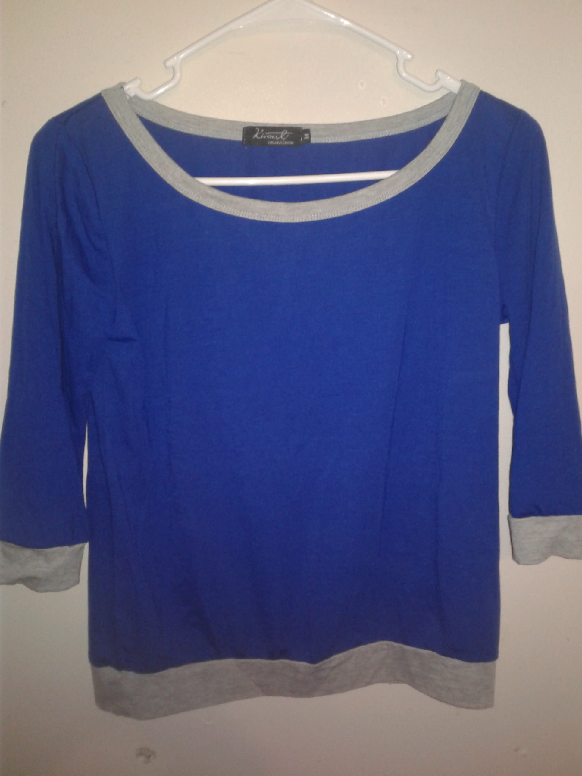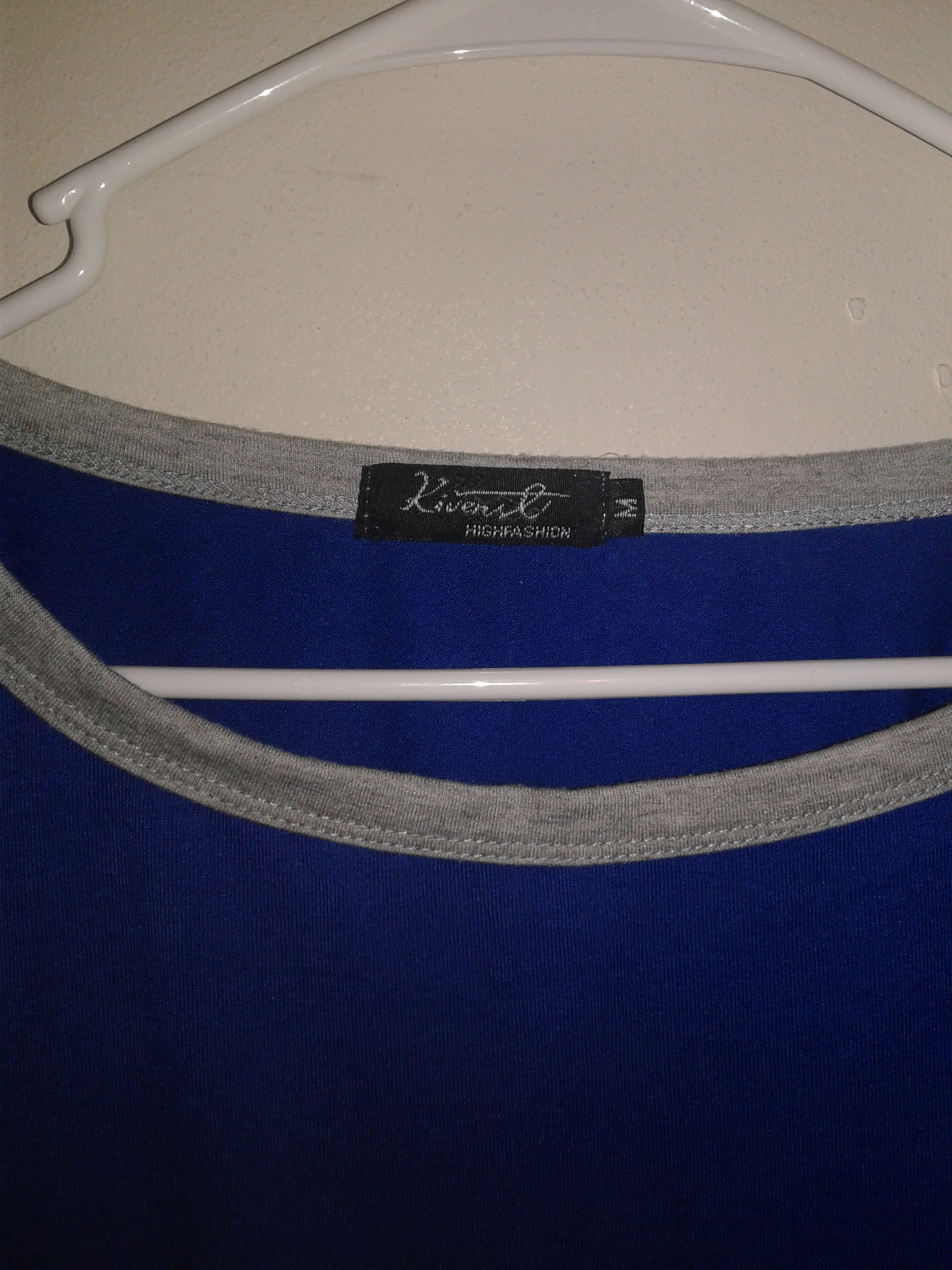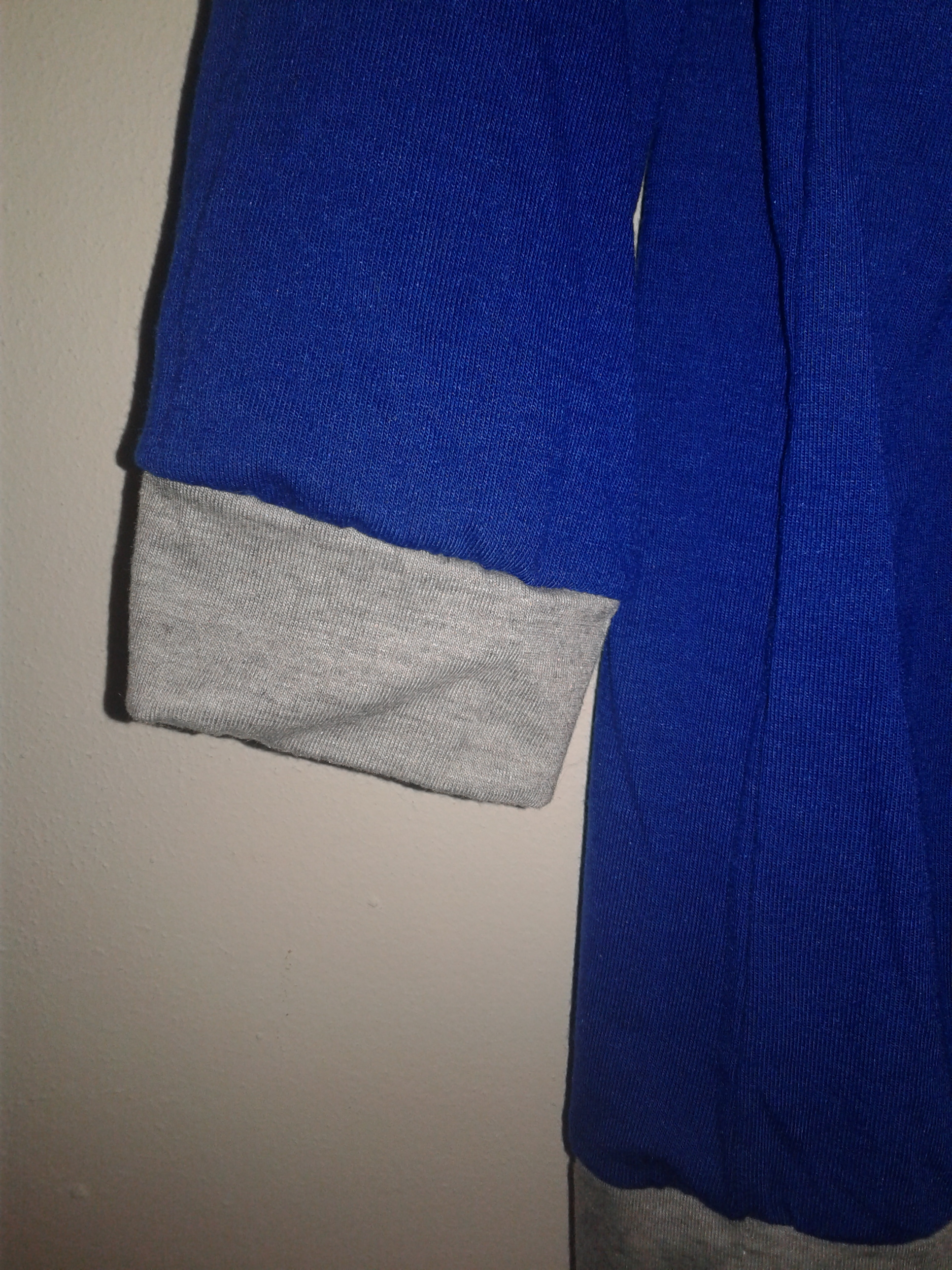100% POLYESTER MATERIAL. 3/4 SLEEVE LENGTH. ROYAL BLUE AND BARELY SEMI SEE THROUGH.