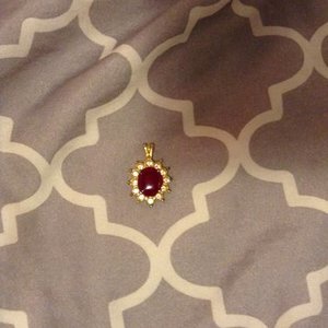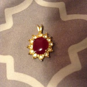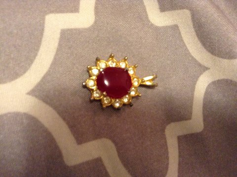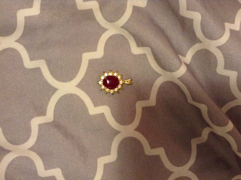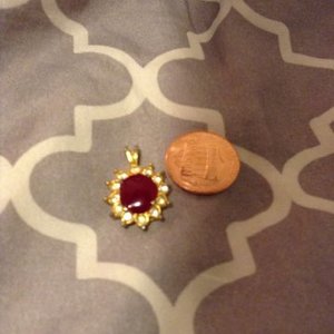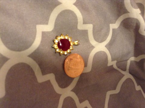This is a vintage gold pendant with a red resin center and clear rhinestones along the outside. Nice weight and pretty! I listed it as "good" because of slight wear due to it's vintage condition.
