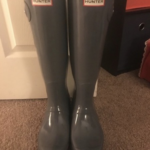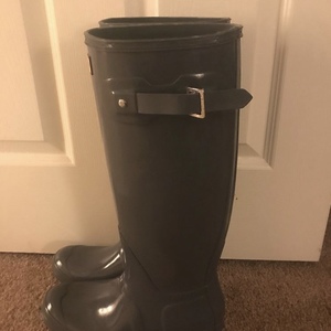 Beautiful and shiny charcoal grey women’s Hunter rainboots! I also have the fuzzy inserts available if needed. Worn only a few times