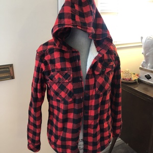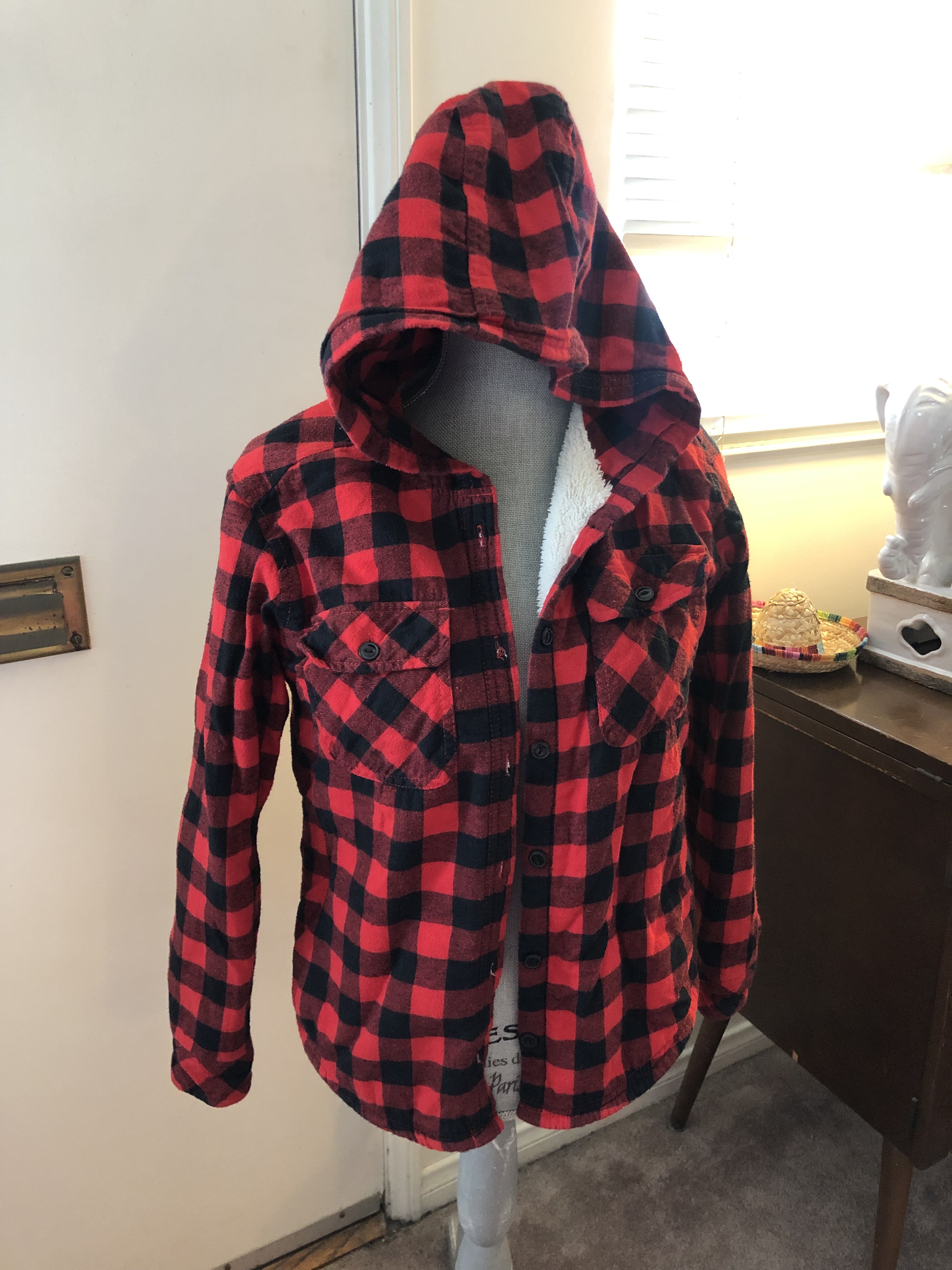 This is a size Small red plaid Sherpa flannel hoodie. I ended up buying another one in Medium.