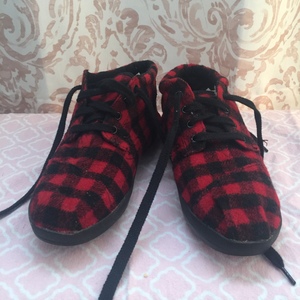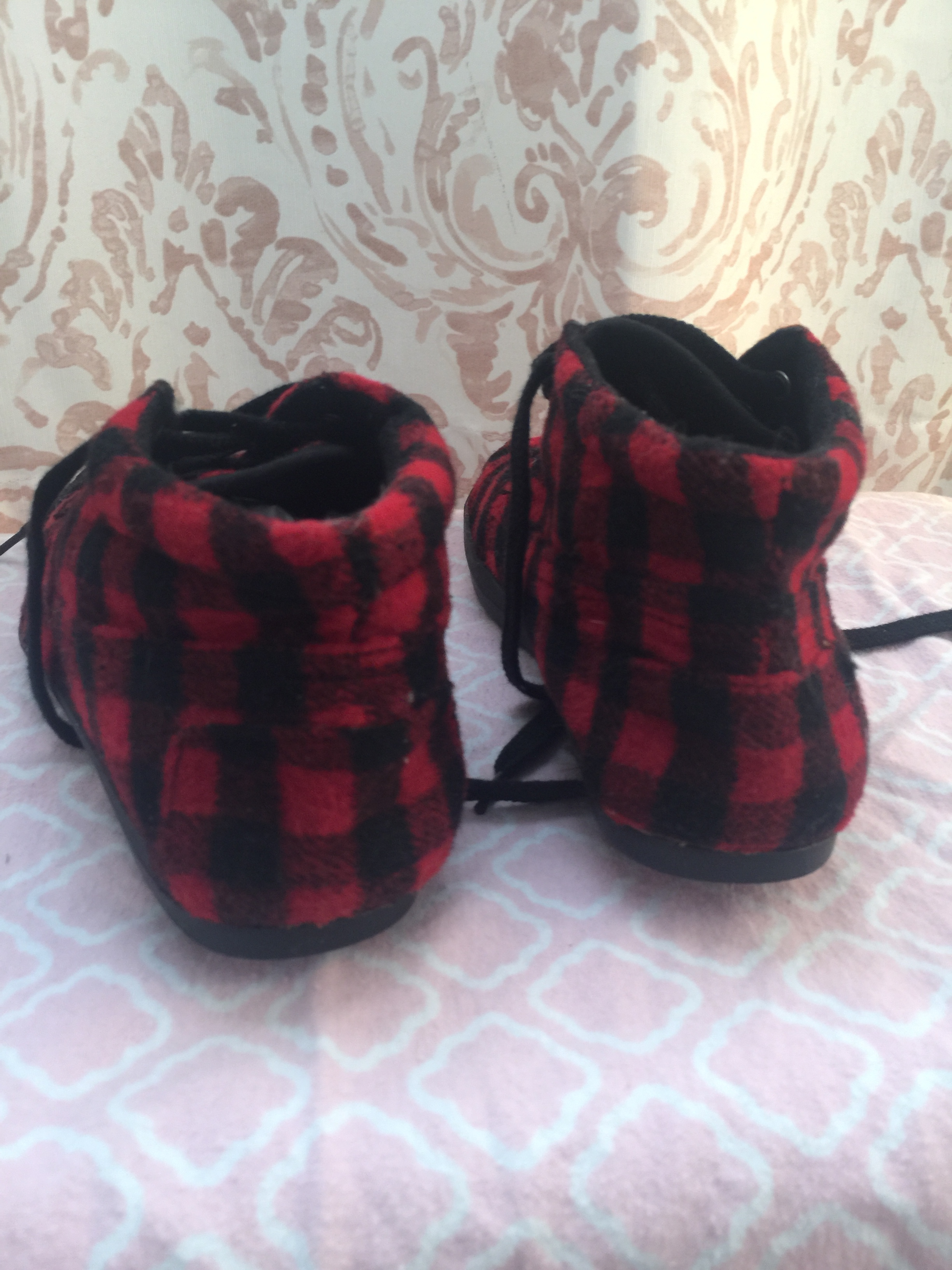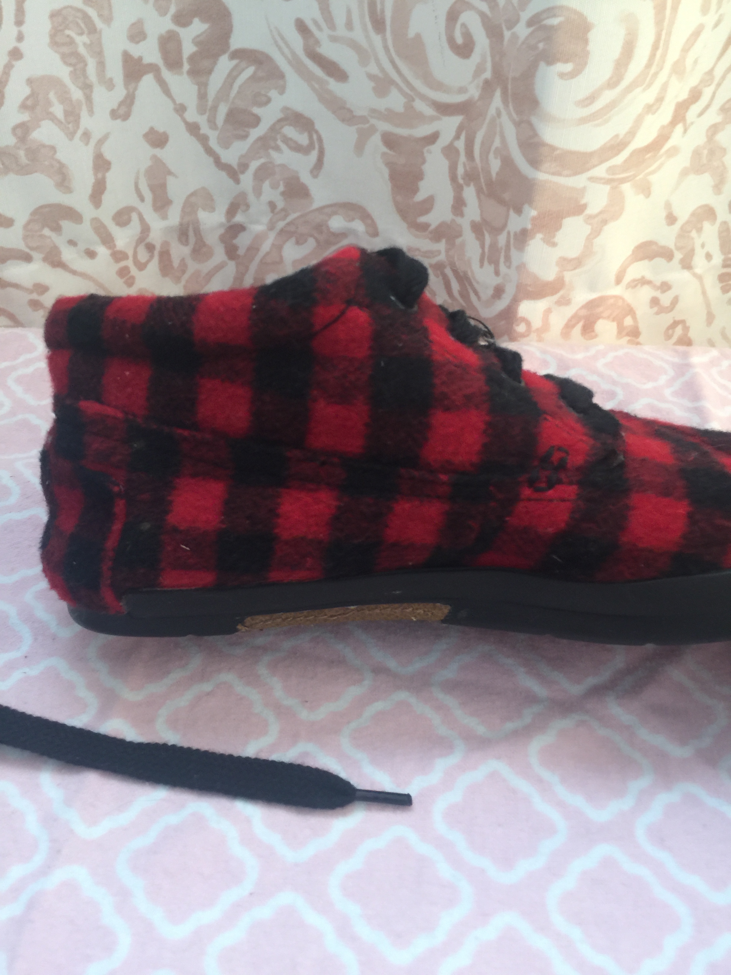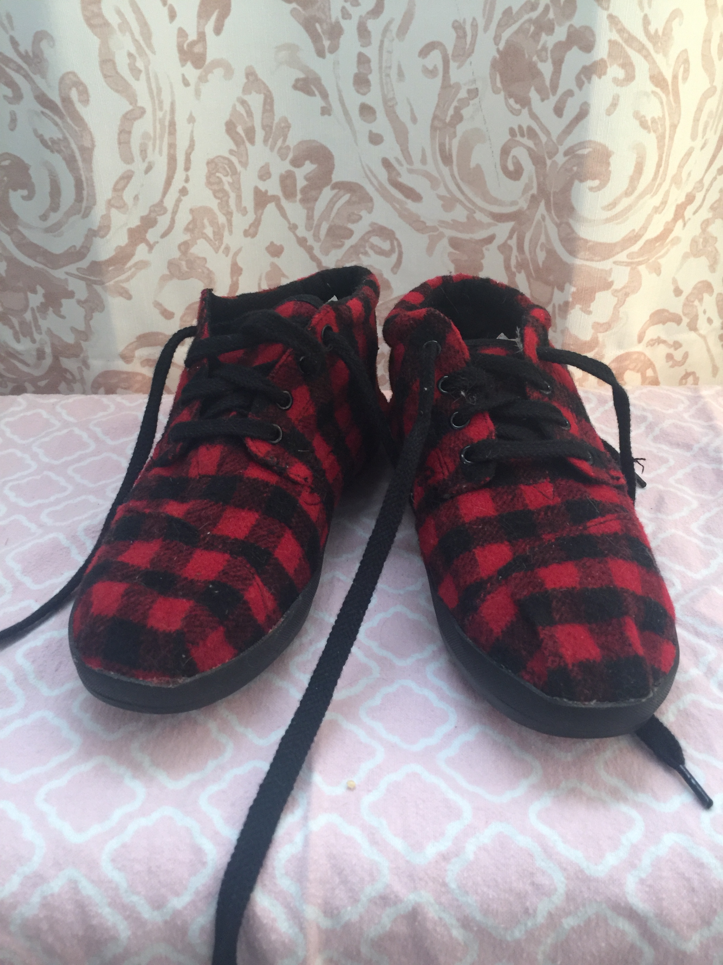 Very true to size. Sketchers shoes with black and red plaid felt material. Very comfy and cute. I actually never wore them but they’ve been sitting around with hopes they will get worn.