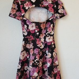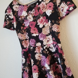 Forever 21 floral skater dress, circle skirt, not too short, has a cute cutout in the back, short sleeved, really flattering... looks great with heels or trainers, fairly stretchy material, really beautiful dress