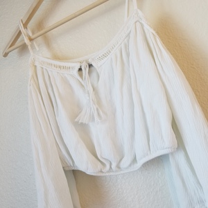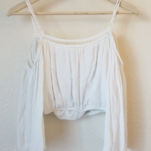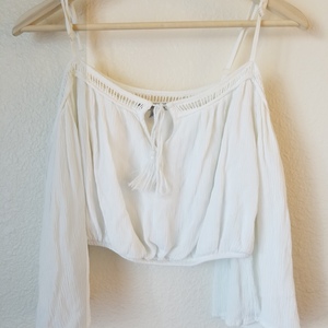Charlotte Russe white shoulderless or "off the shoulder" crop top, perfect for the beach and some shorts (in my opintion), has a tie in the front (I've never untied it), flowey sleeves (3/4 sleeves) adjustable straps, and overall a nice shirt!