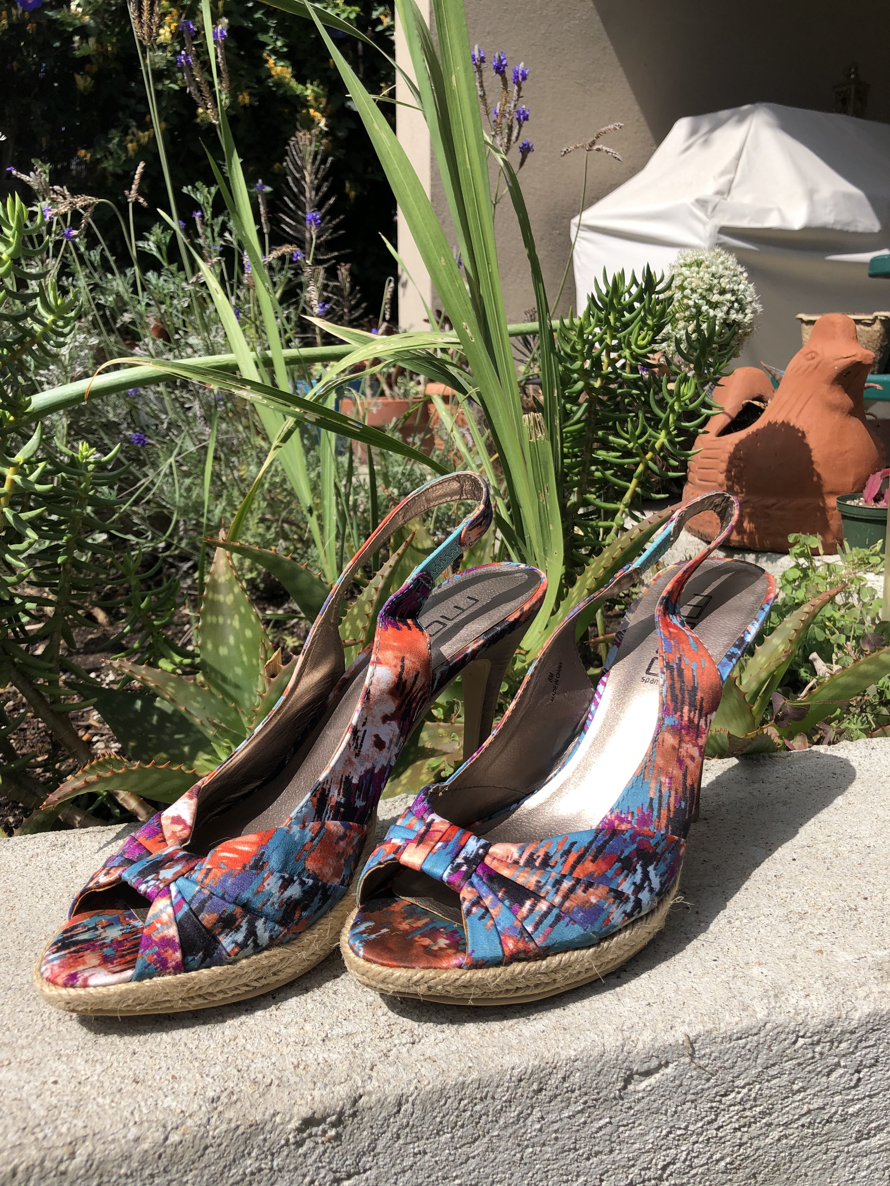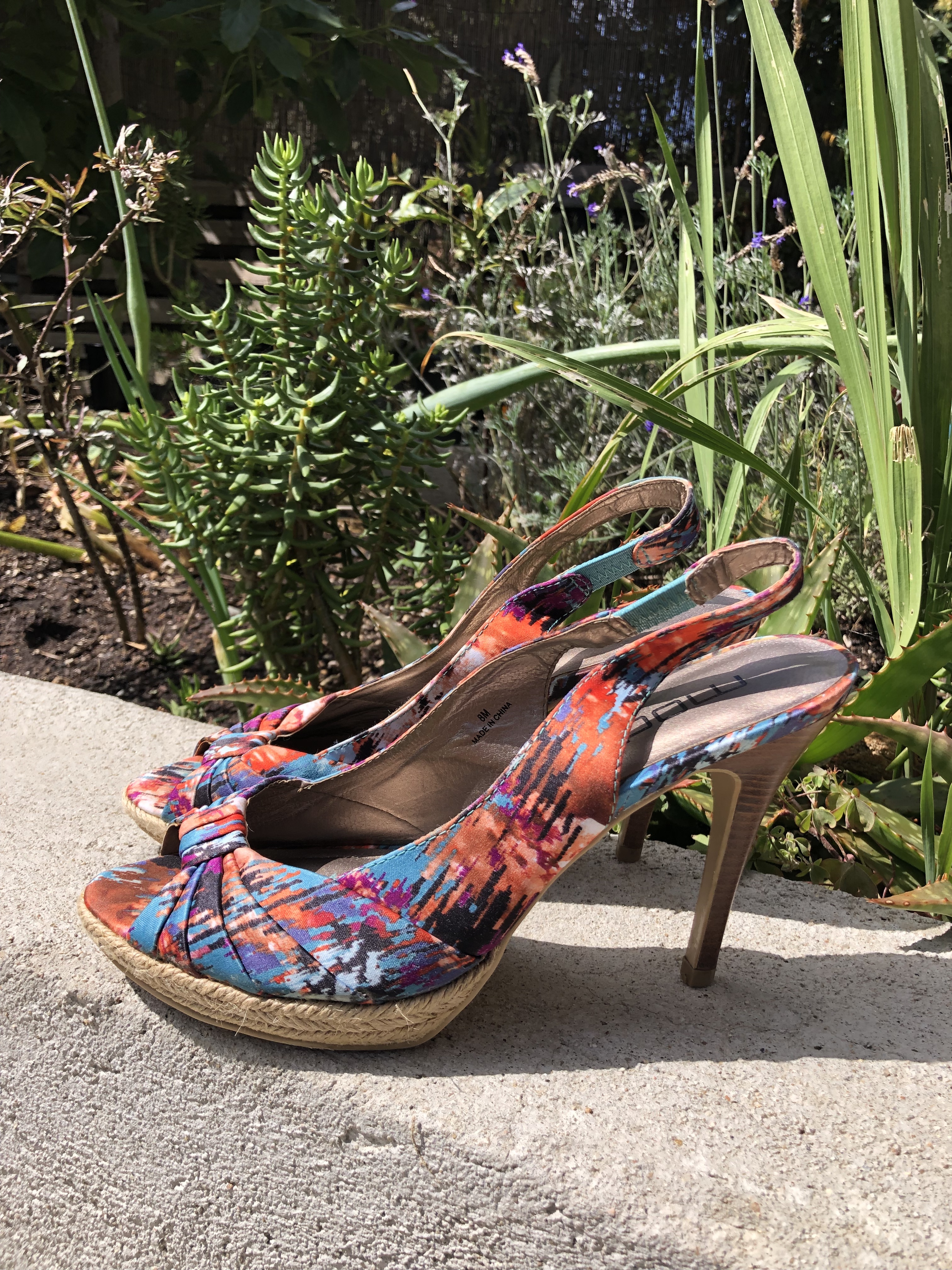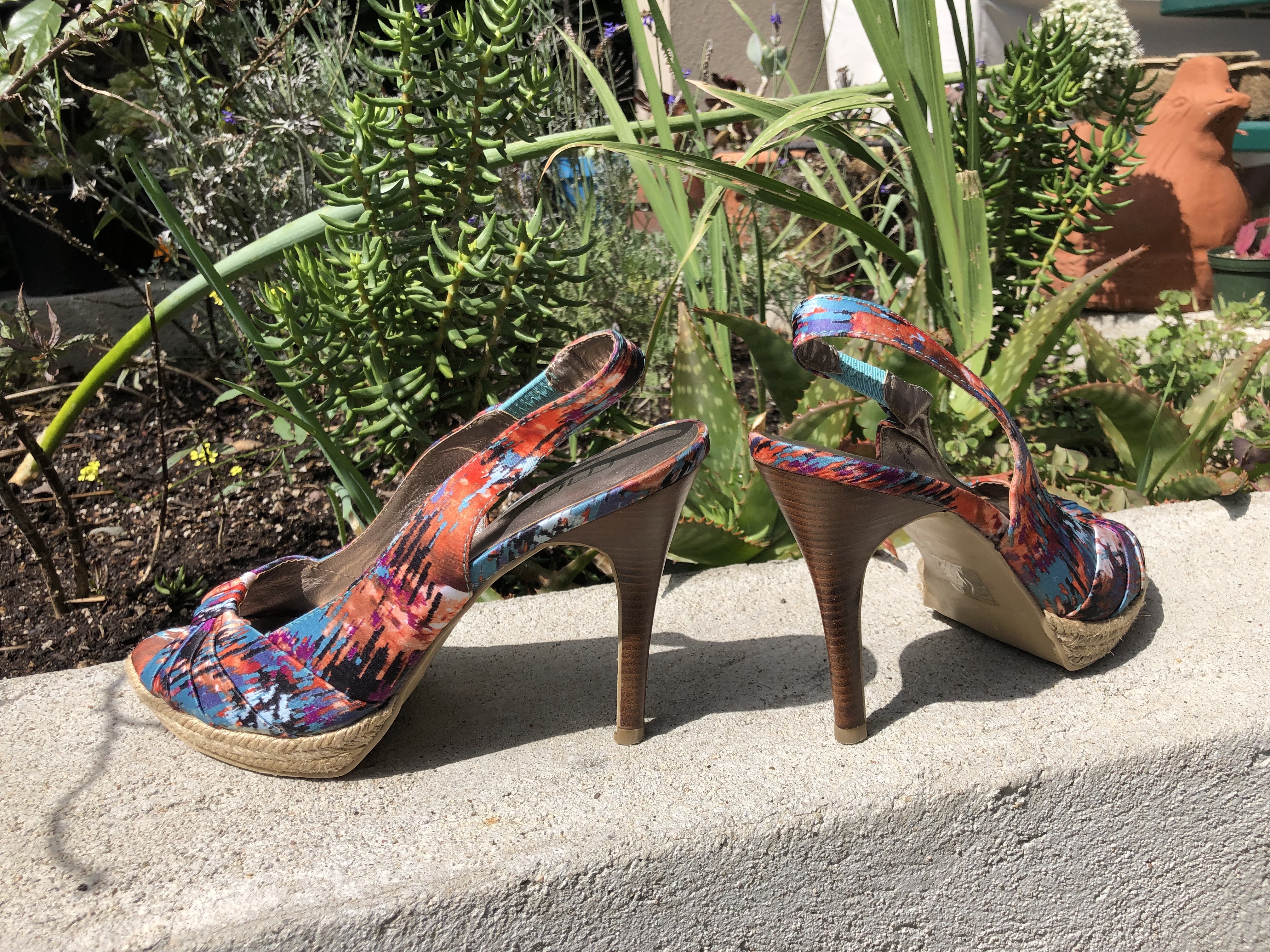 Moda Spana heels size 8. Worn once to the horse races and been sitting in my closet ever since. Purchased at DSW for about $50. They are a cloth material with a paint graphic print. Espadrille with spike heel. Love!