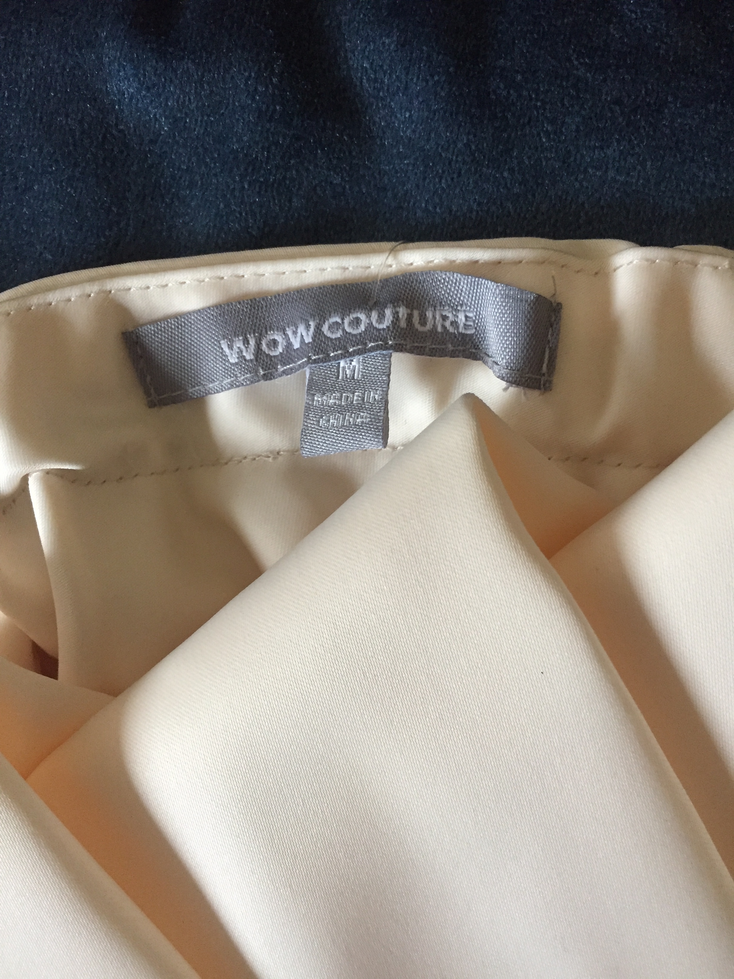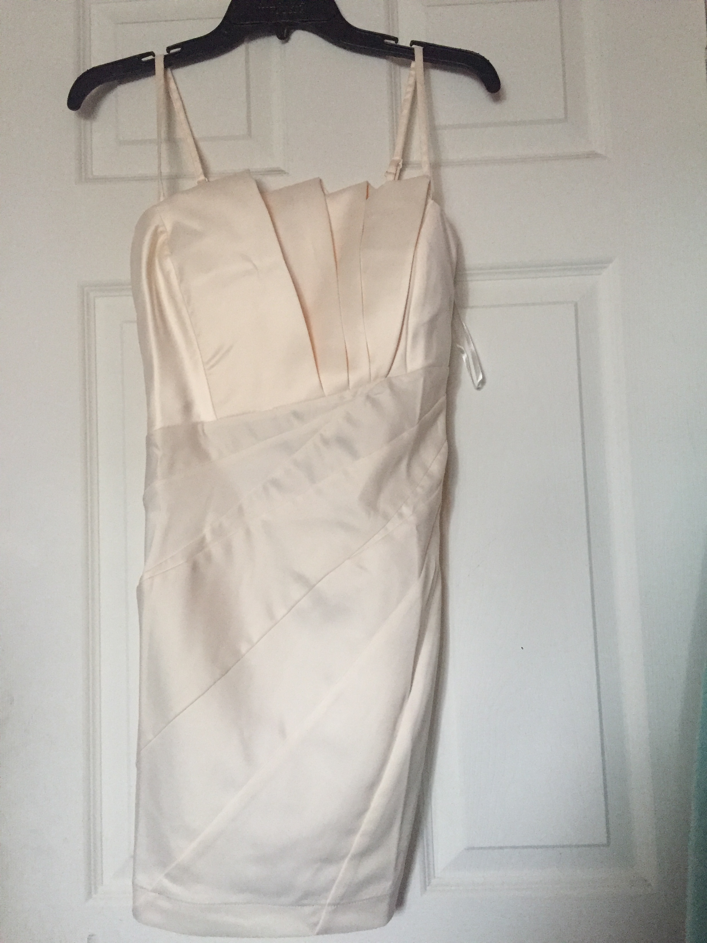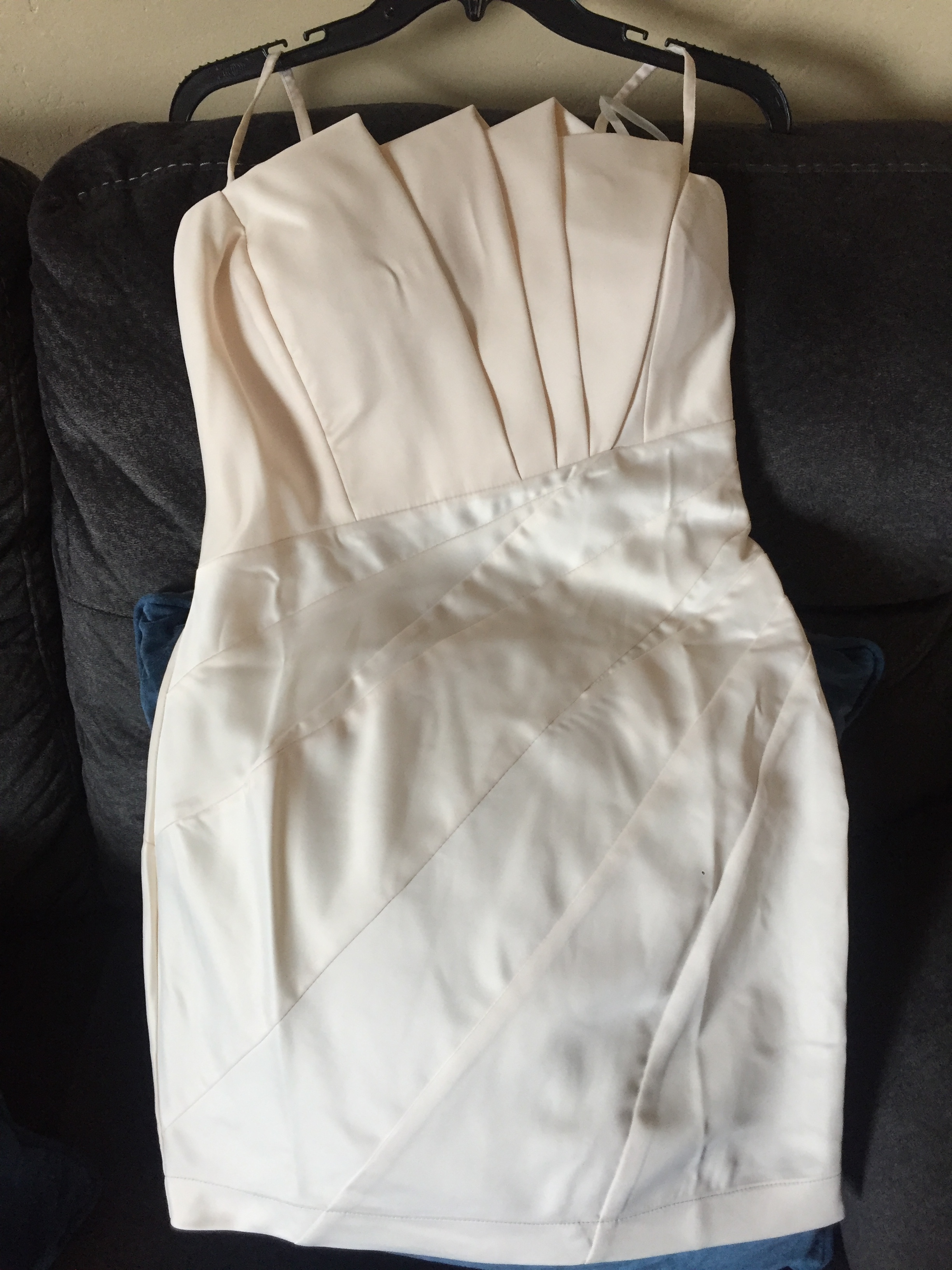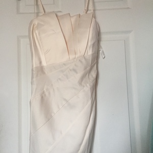 Wow Couture champagne dress says M but its probably an XS. I can take measurements if needed. Top is lined, skirt part is not lined. Brand new without tags. Will need some steaming to smooth out some wrinkles.