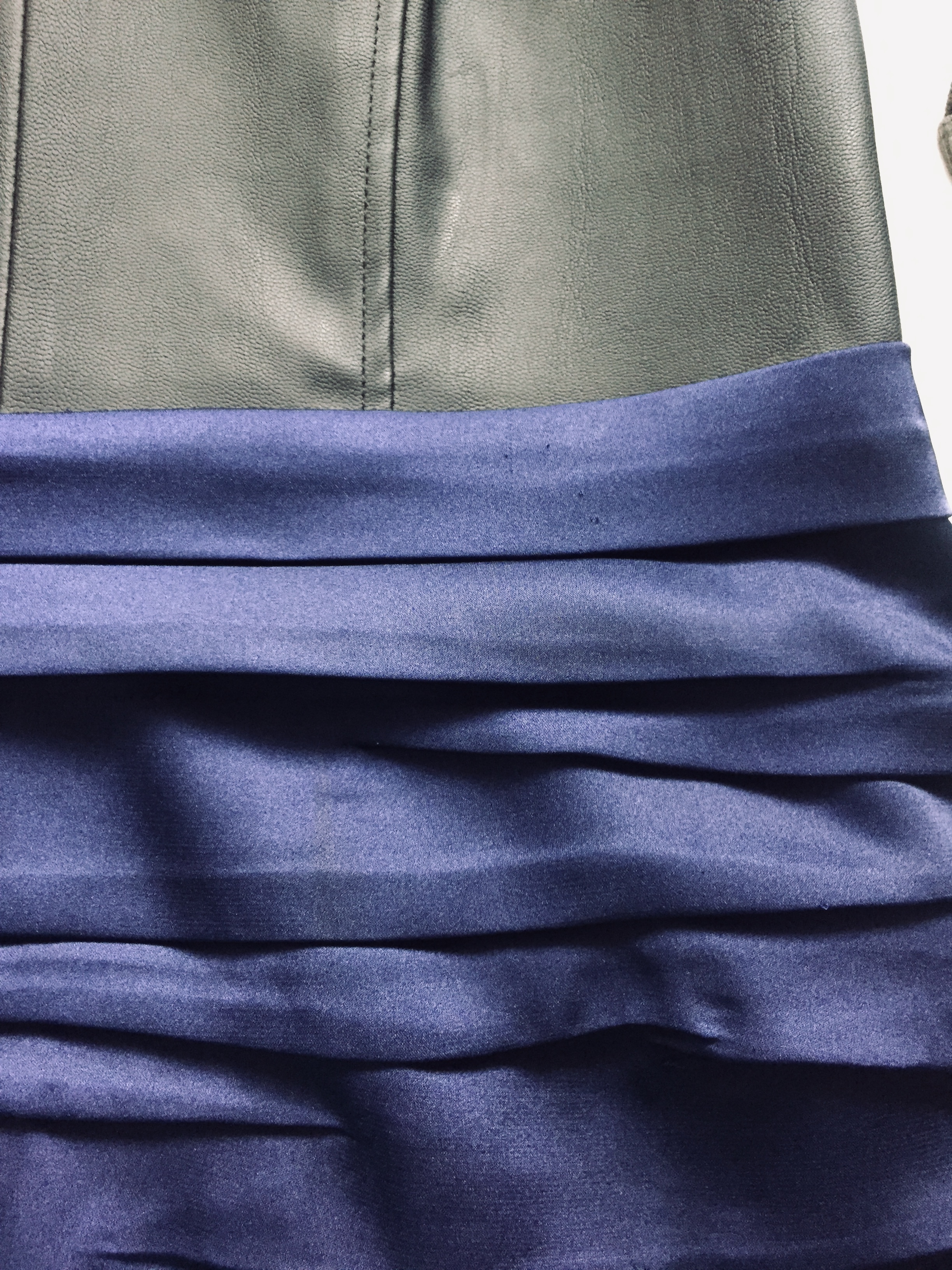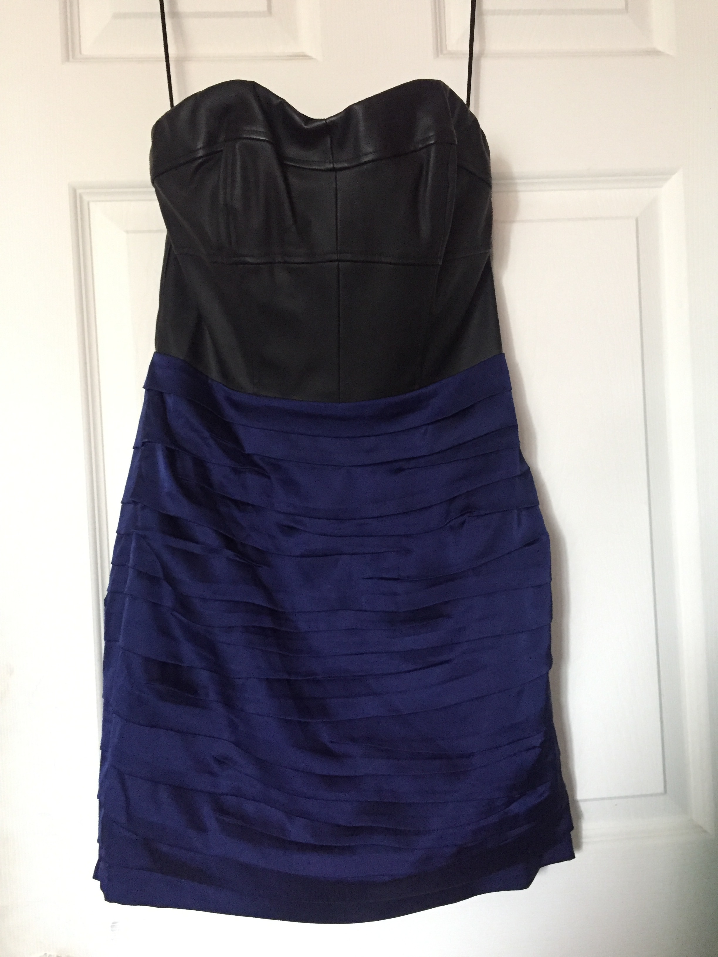 Size 4 dress. Express plested dress. Faux leather bodice. With straps included. Brand new without tags. Minimal pulling on skirt. And minimal peeling at the zipper. Look at the picture for these imperfections. Any questions, ask.