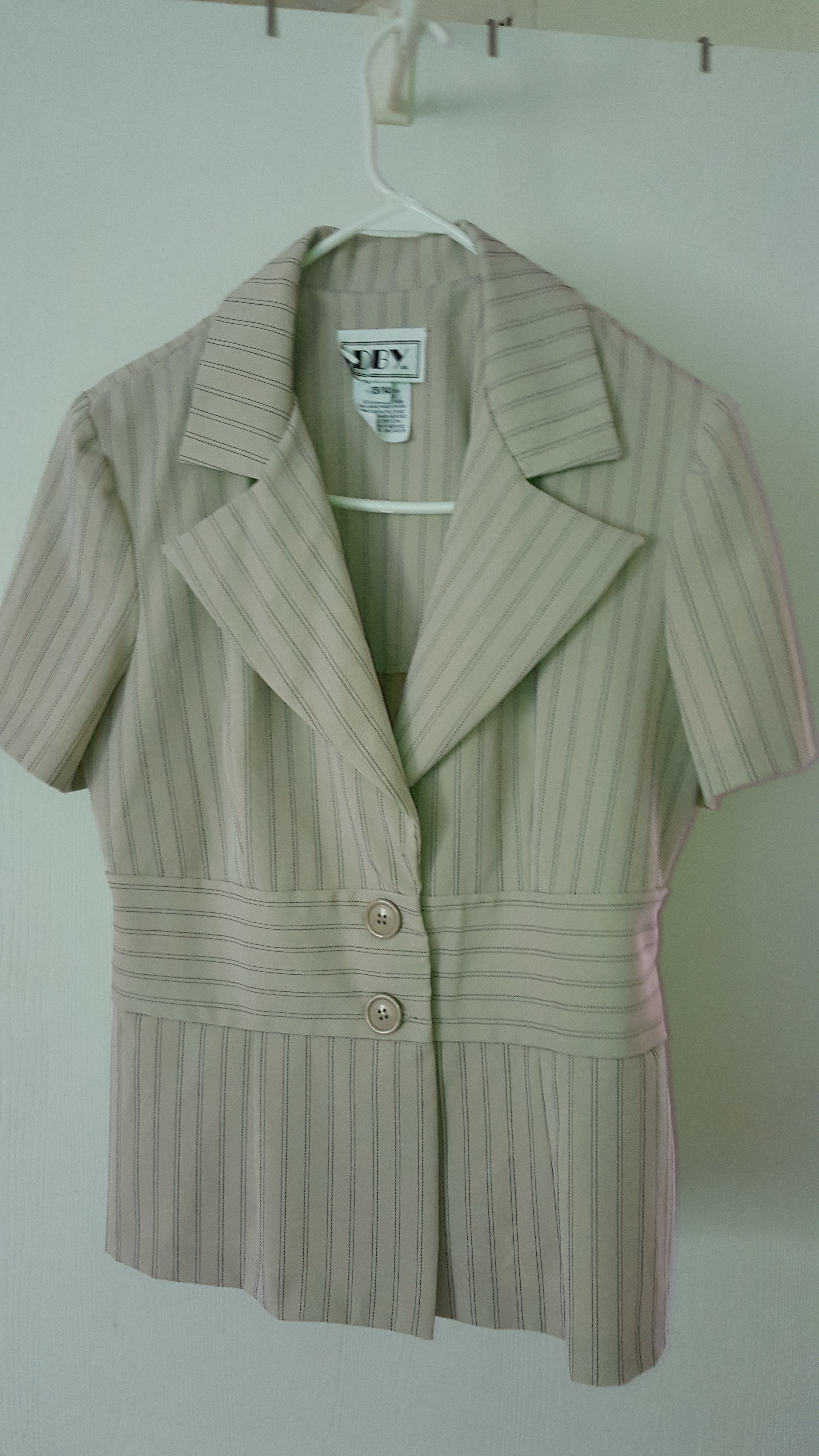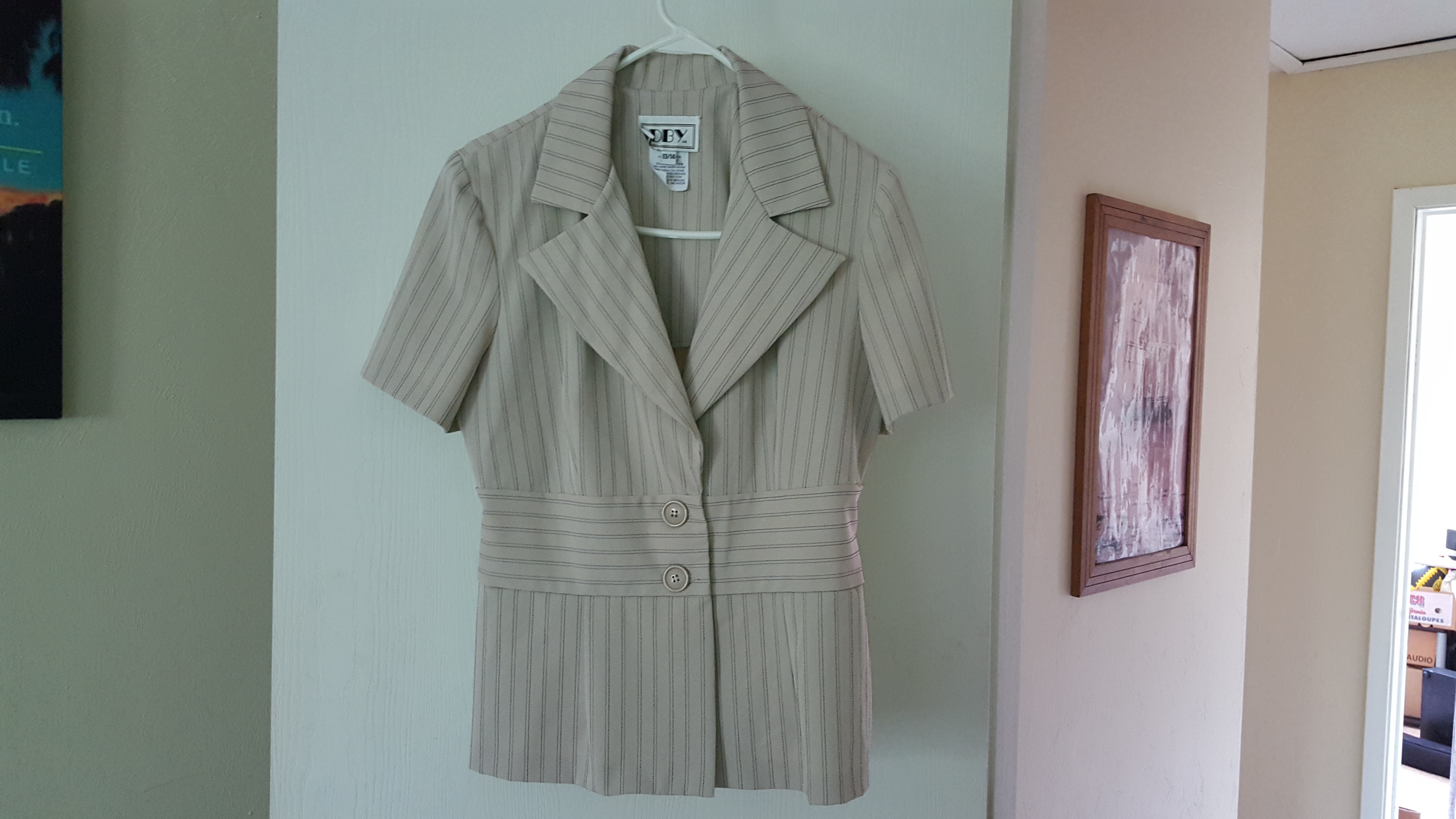 Short sleeve, blazer/shirt. Could be worn either way. Poly/Spandex so it has a bit of stretch to it. Comfort with a retro look. I like the wide lapels because I own a few cool broaches.