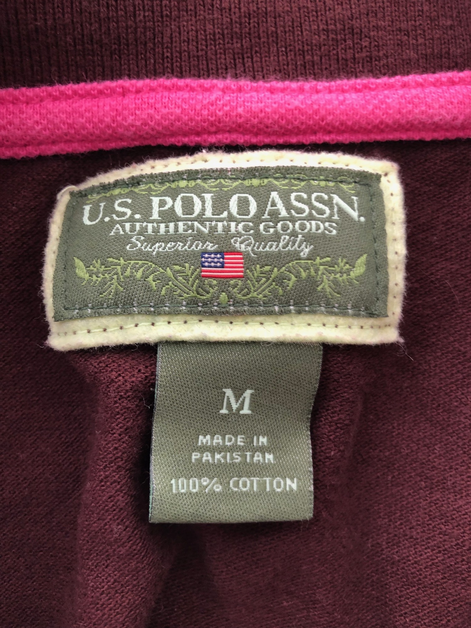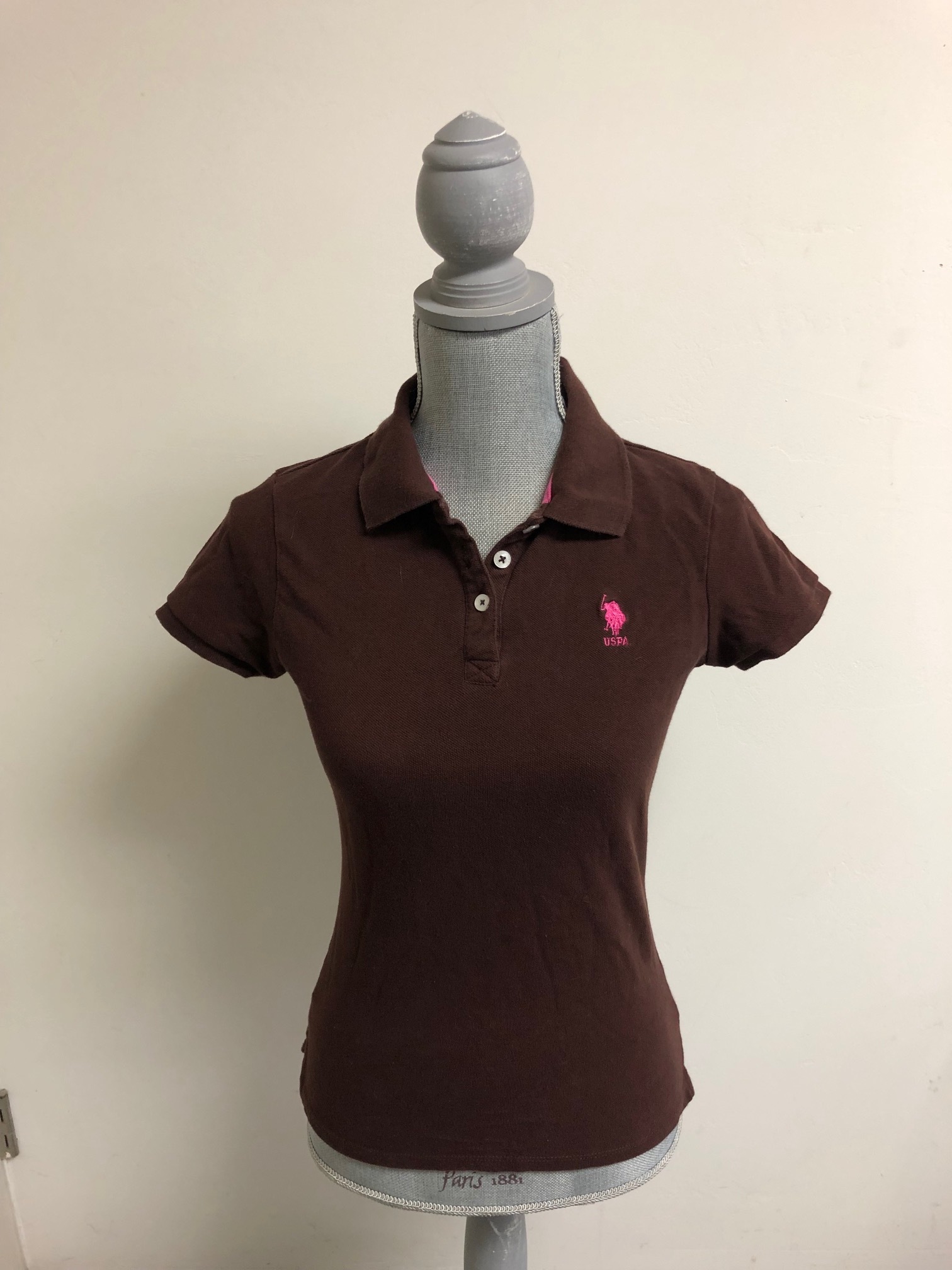 U.S. Polo Assn. polo shirt. Technically a size Medium but fits like a small. Barely worn. It's a nice brown color with pink accents.