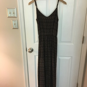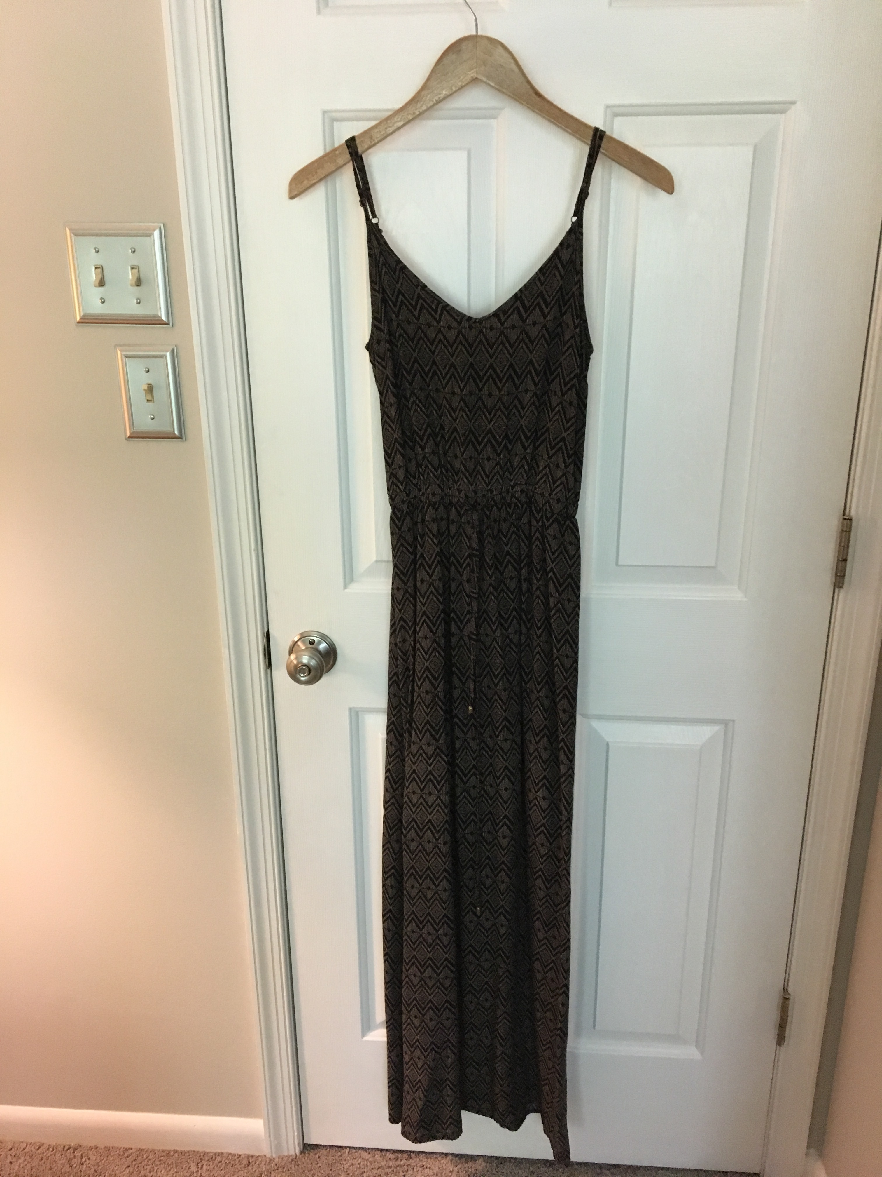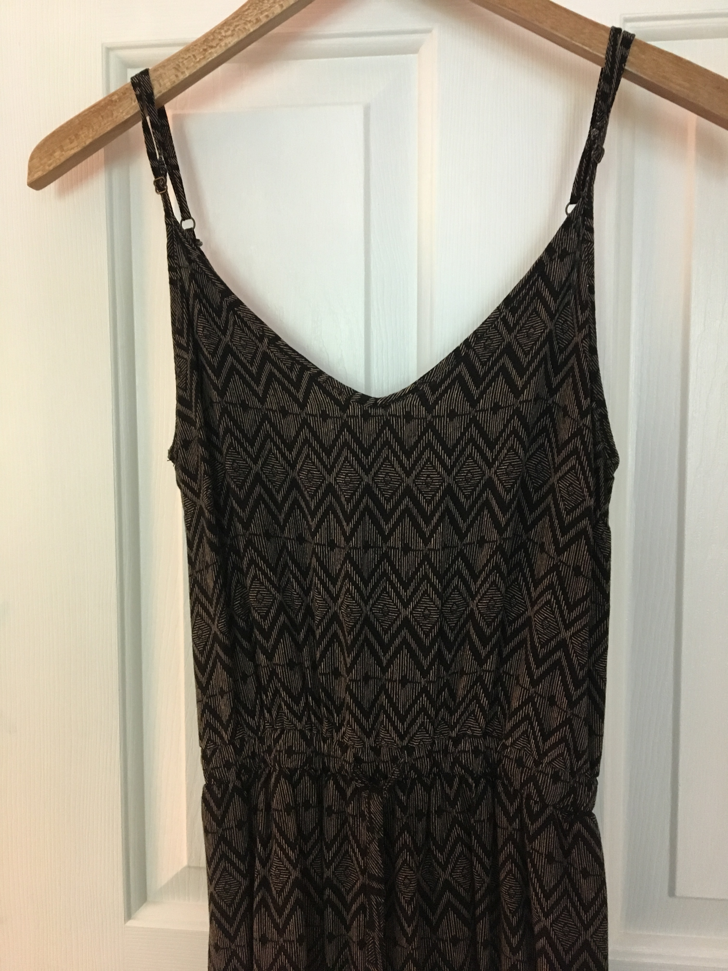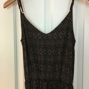 This Forever 21 dress is in practically new condition. It is equal parts black and earth colored, with a consistent diamond pattern. There is a drawstring at the waist for adjustment, as well as adjustable straps at the top. It is a size small.