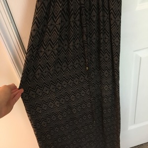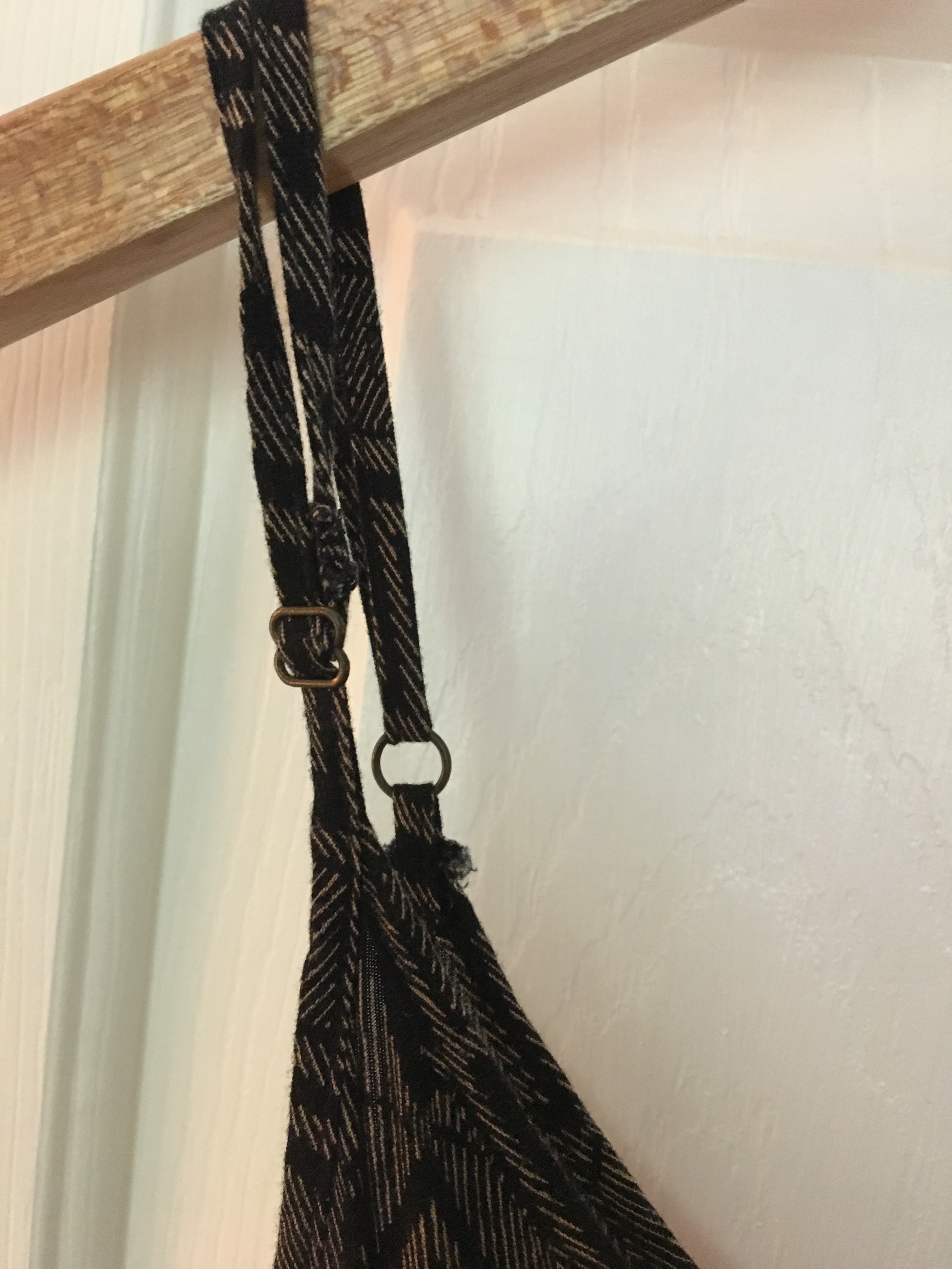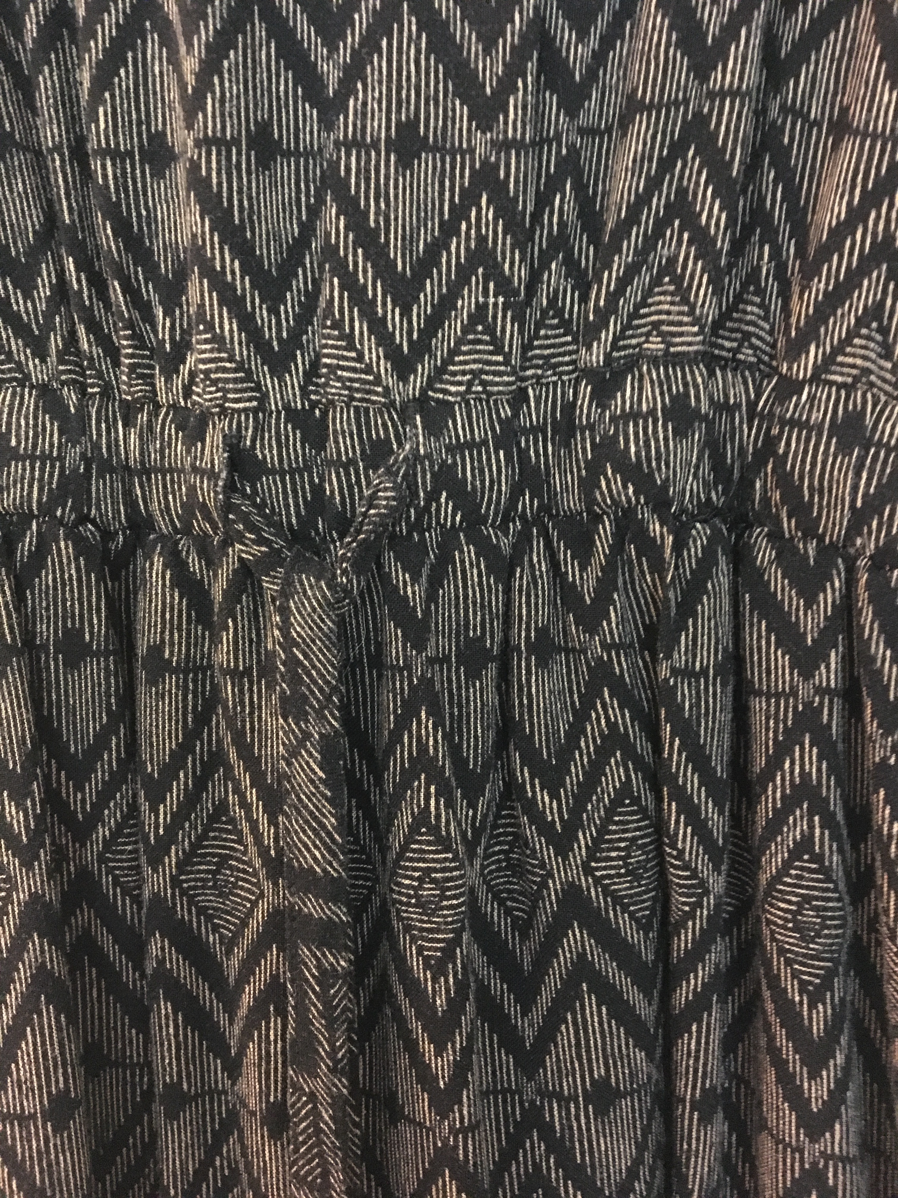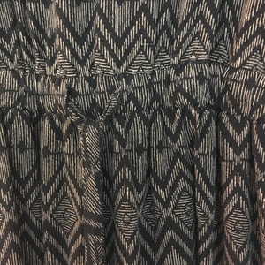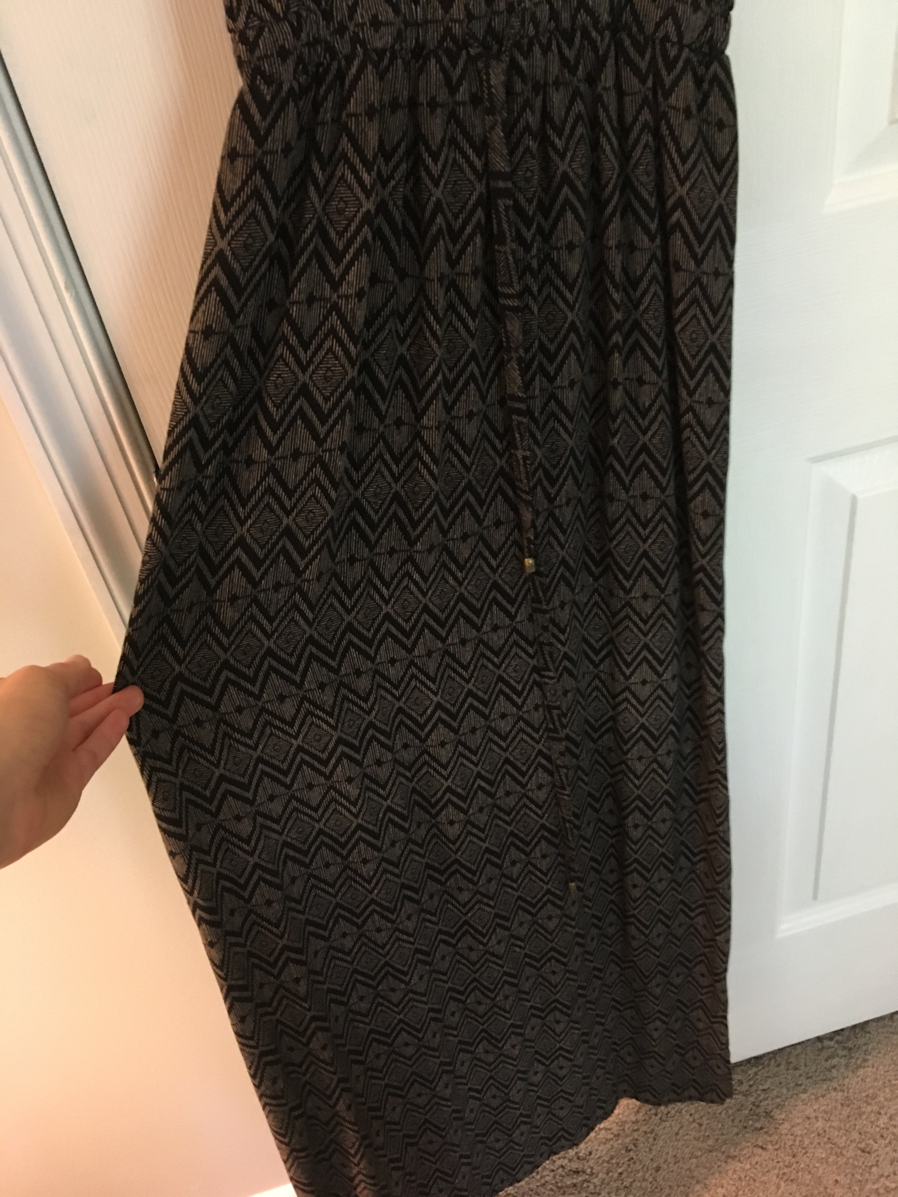 This Forever 21 dress is in practically new condition. It is equal parts black and earth colored, with a consistent diamond pattern. There is a drawstring at the waist for adjustment, as well as adjustable straps at the top. It is a size small.