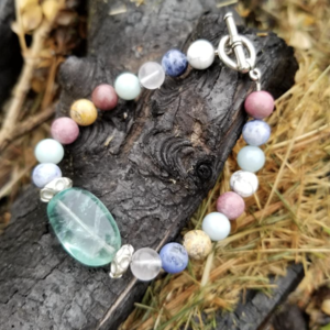 Fluorite crystal (the larger stone) is natural and is thought to help develop connection to spirit. The smaller stones are also all natural. Has silver clad toggle closure.