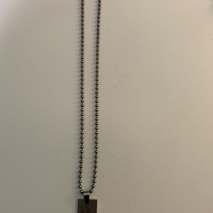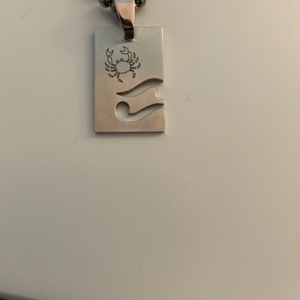 This silver necklace contains a silver rectangle with a wave cut out of us and a crab engraved into it.