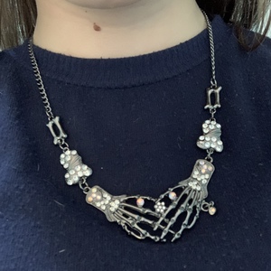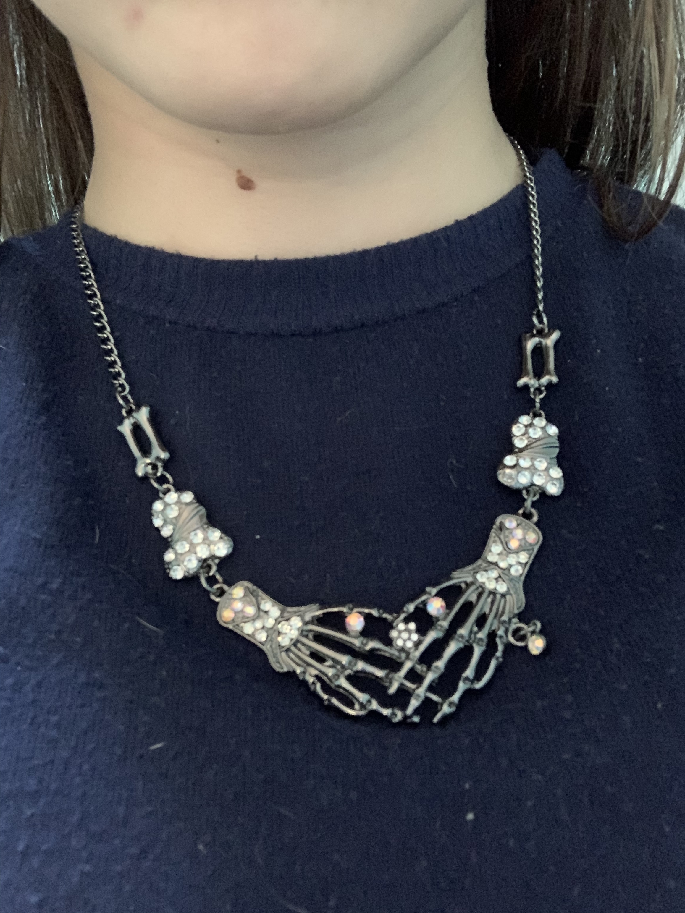 This necklace contains two skeleton hands holding each other with bones on the sides of them and many gems set into them.