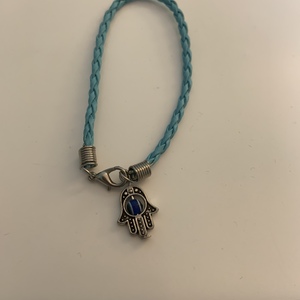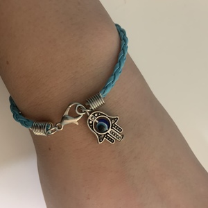 Turquoise rope with hamsa pendant, the hamsa has a spinning eye.