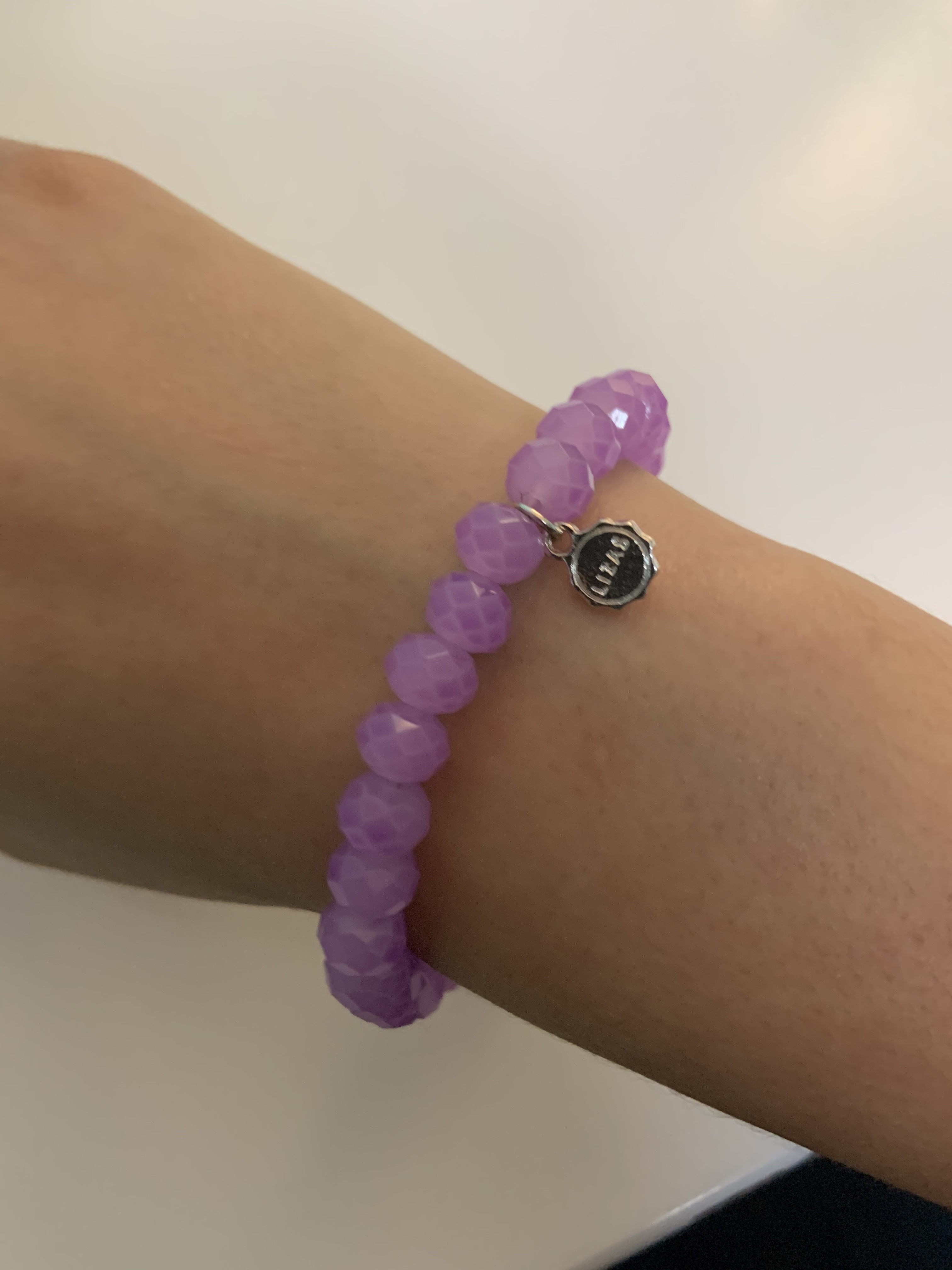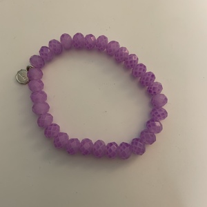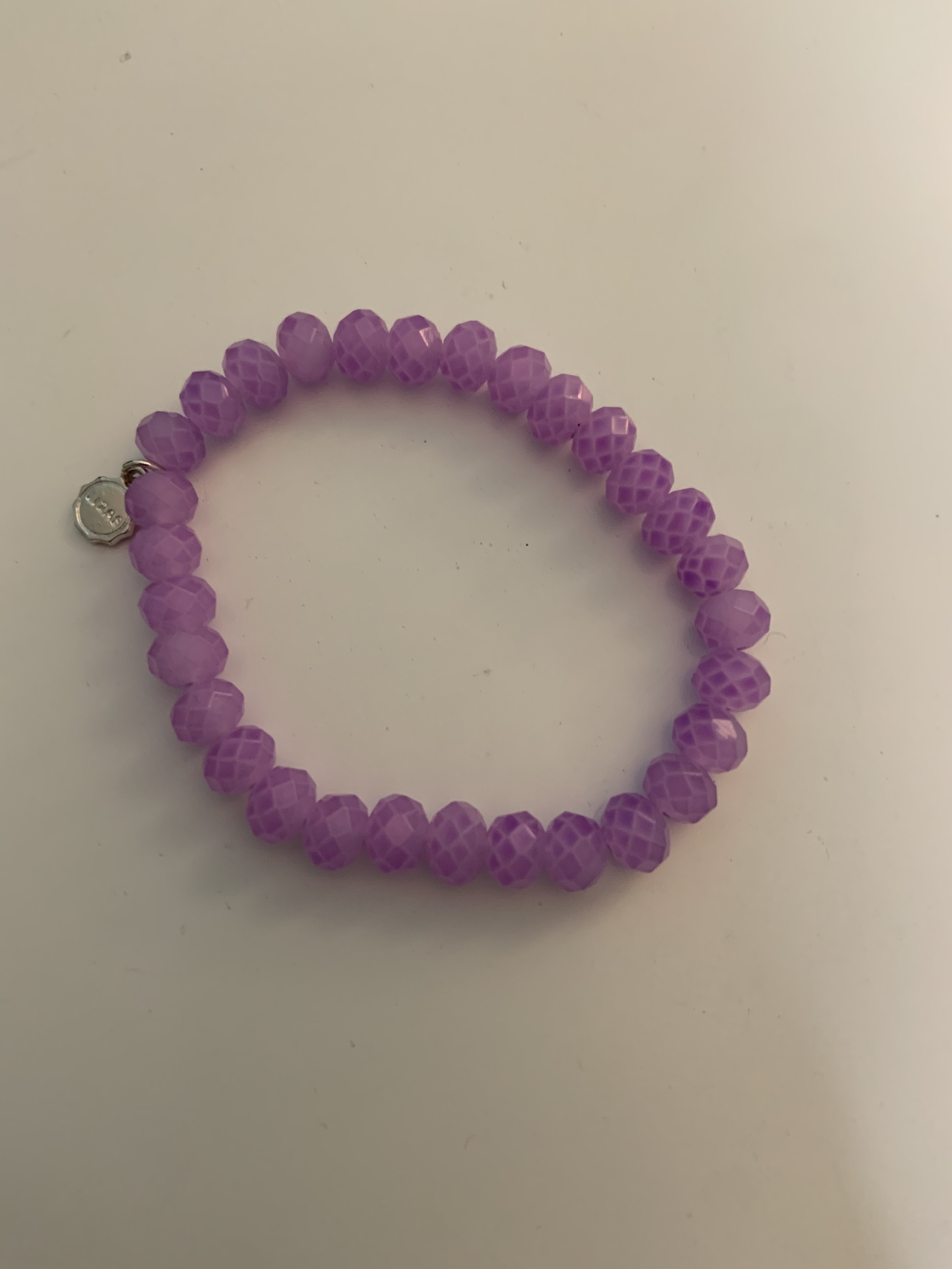 This bracelet contains a string of bright lavender beads. It is elastic so should fit most.