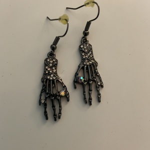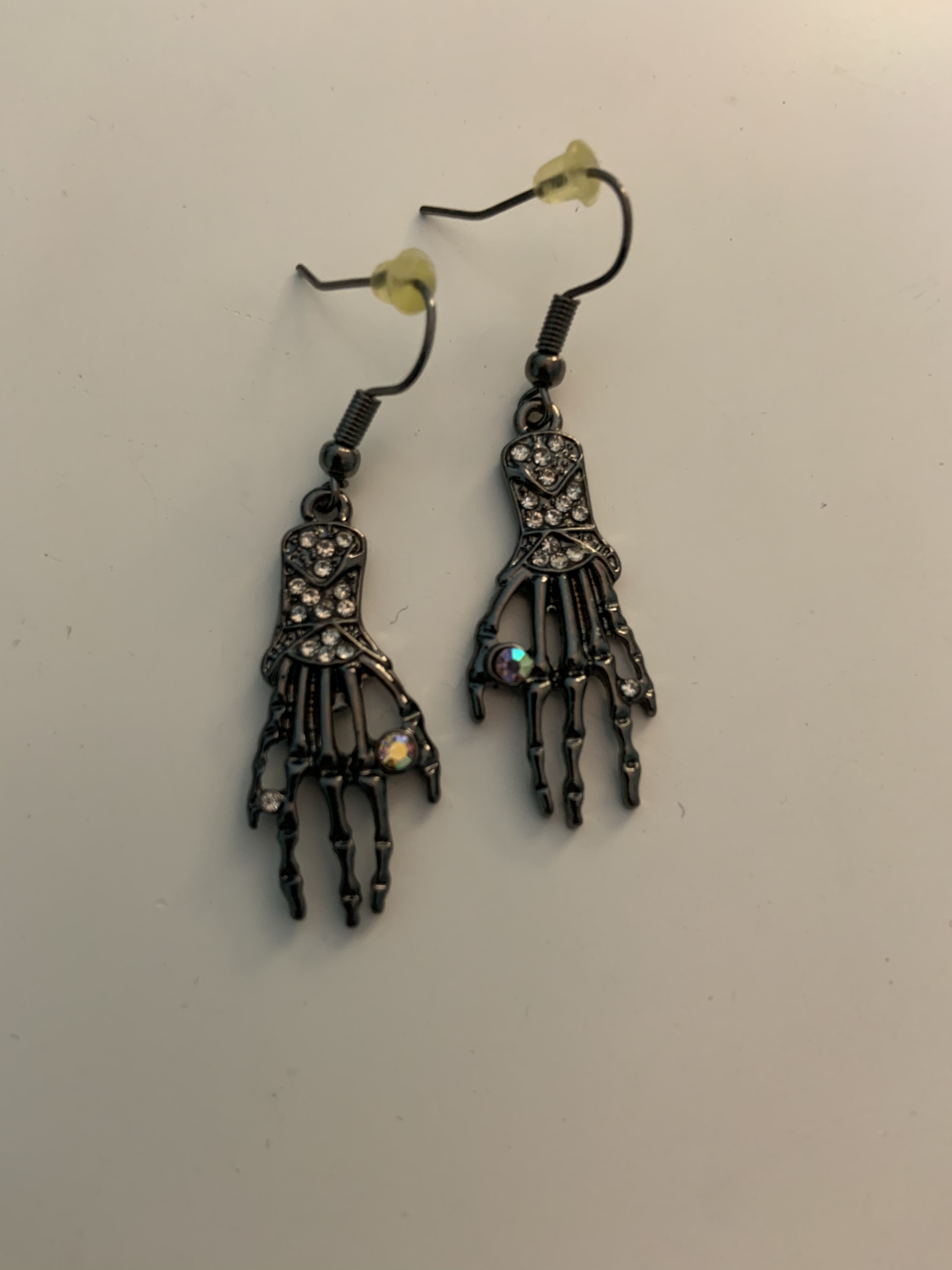 Dark silver skeleton hand earrings set with holographic gems.