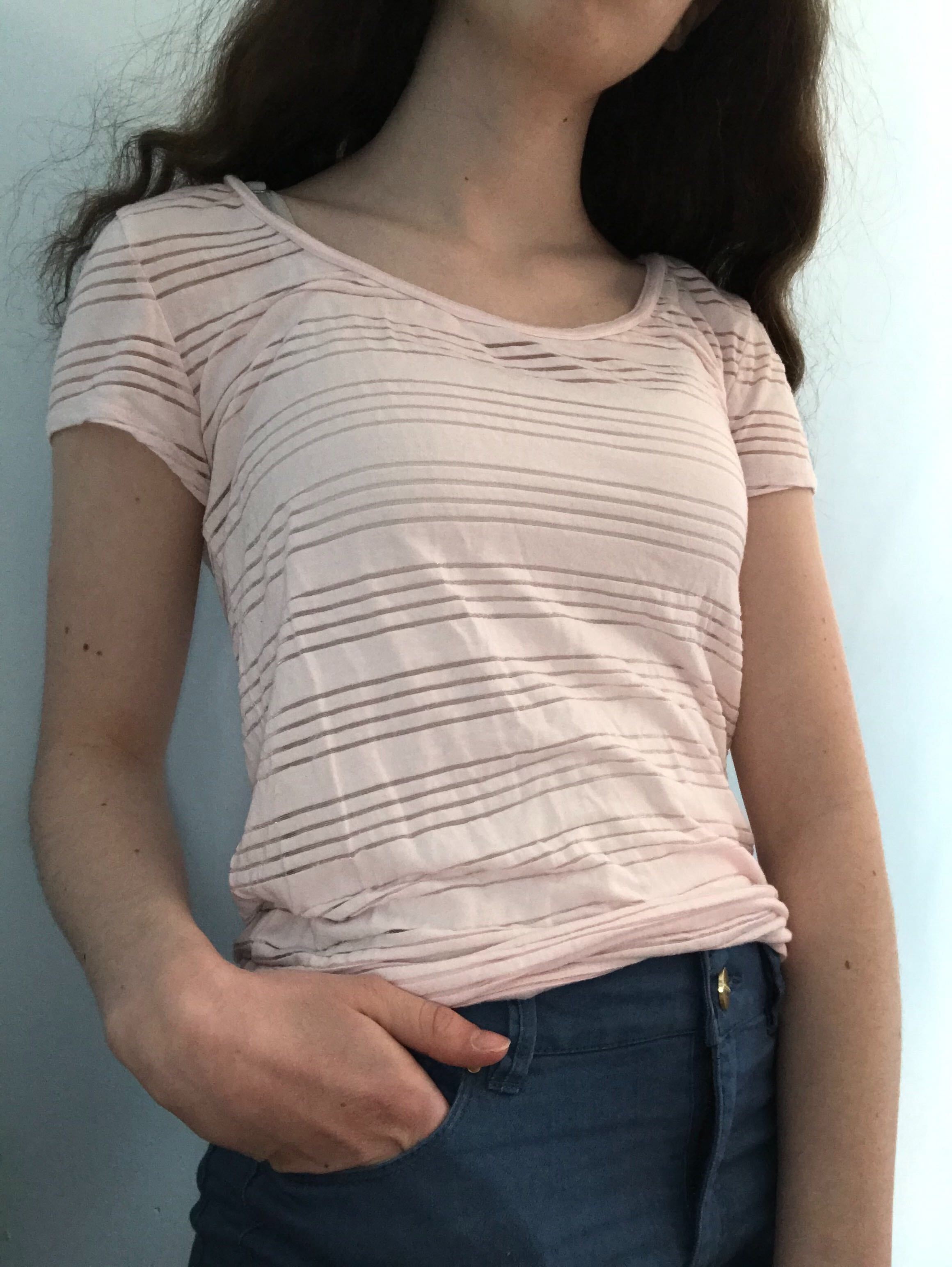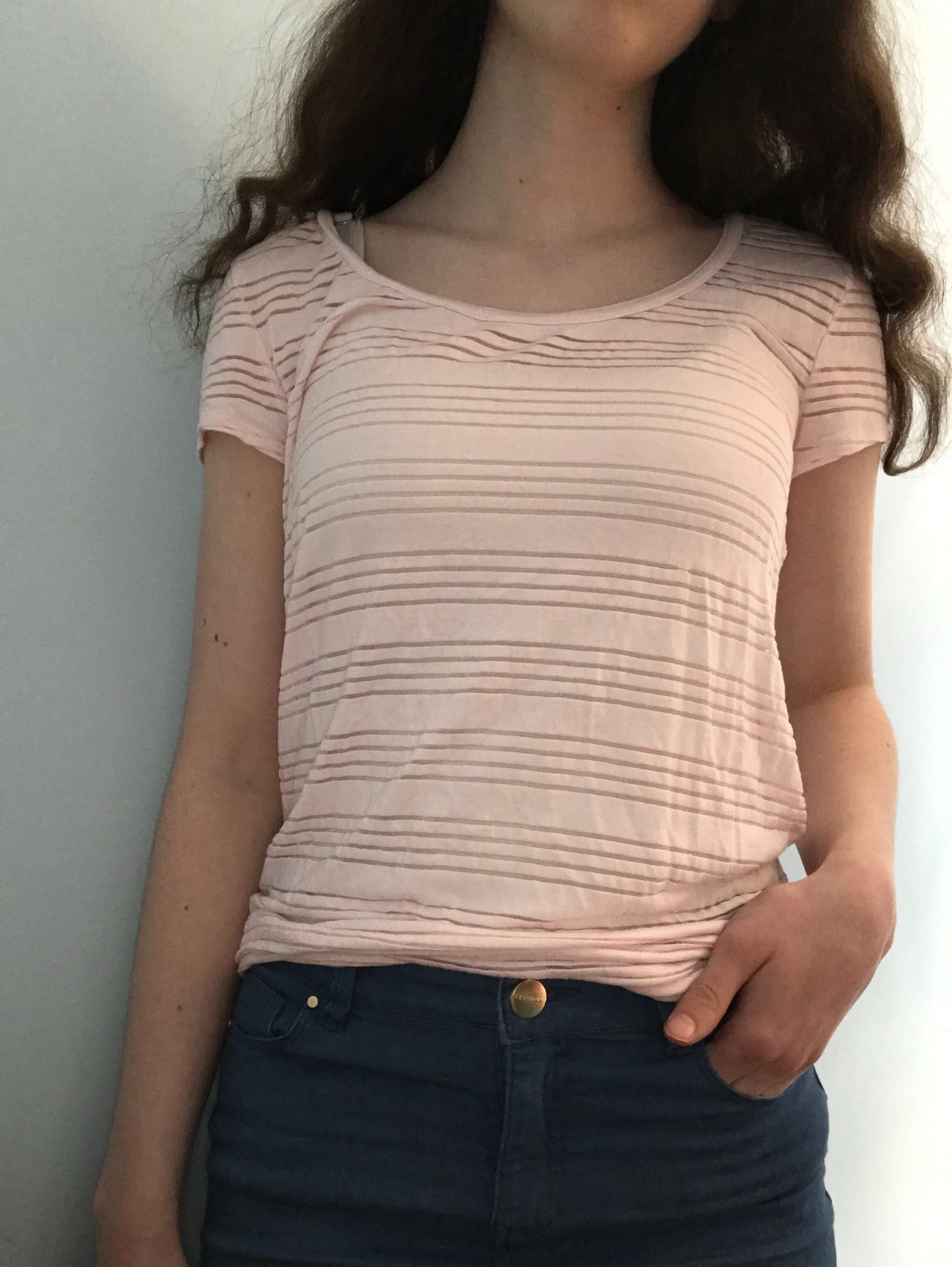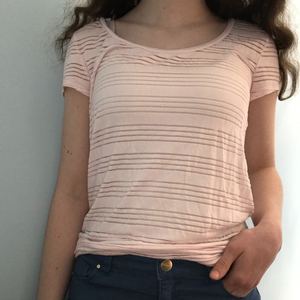 A small shirt from Ann Taylor, great for both formal and casual settings! It features semi-transparent pink stripes.