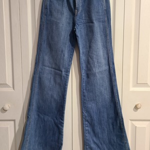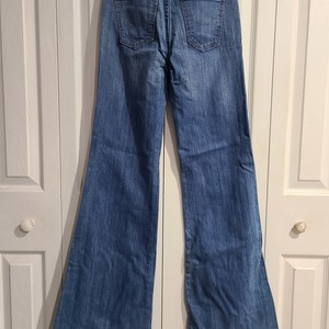 Slight high waist, flare/bell bottom leg, 5 pocket styling. 32 inch inseam.