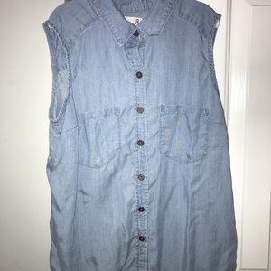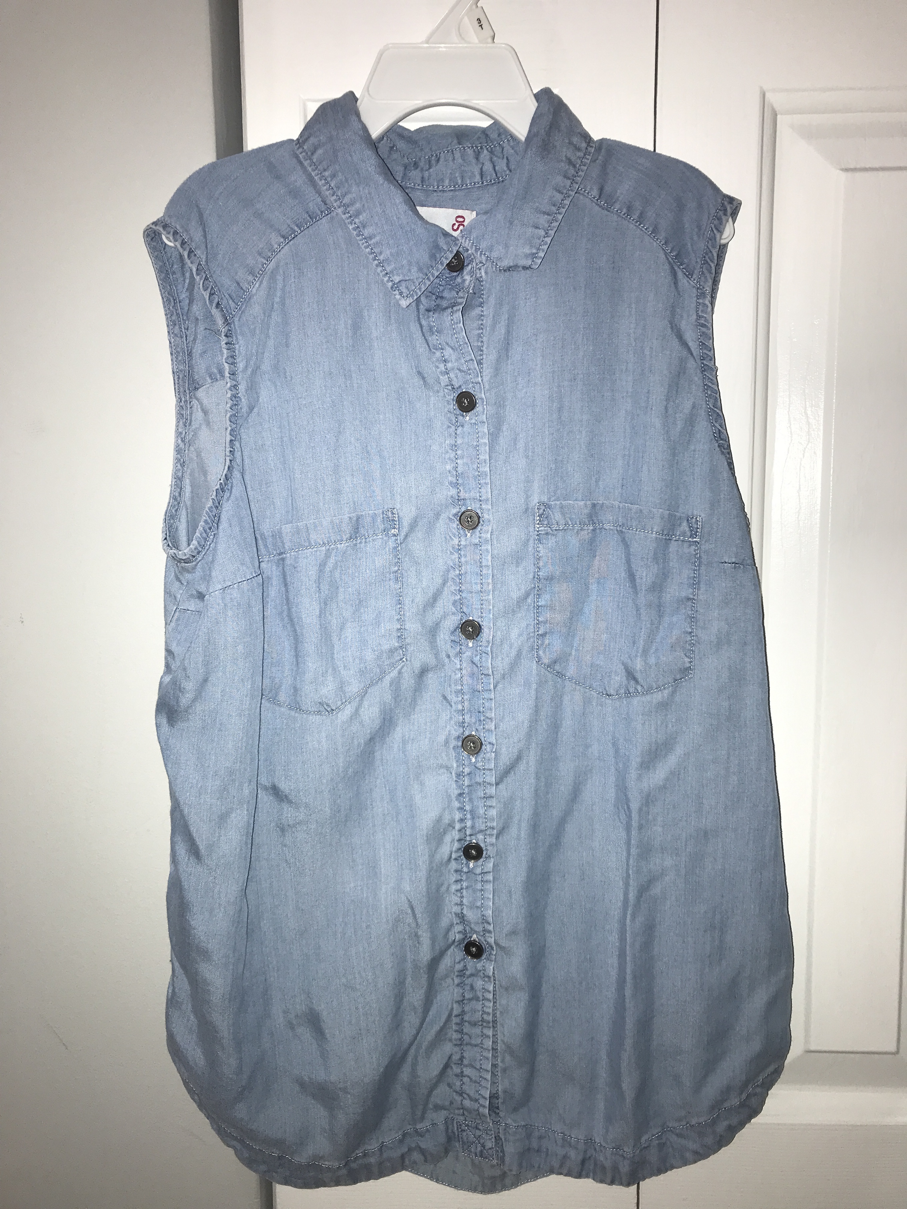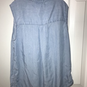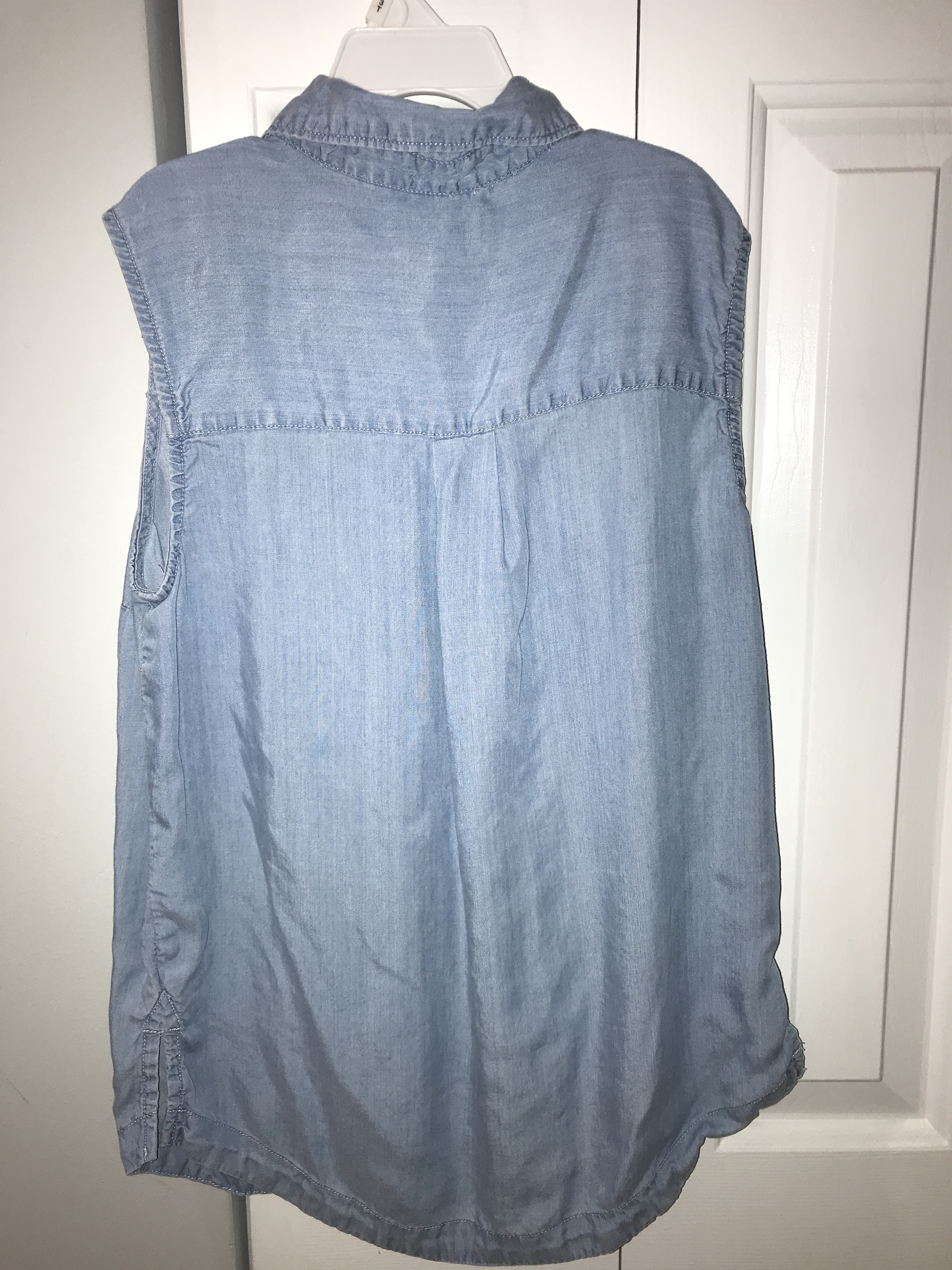 A light blue sleeveless button-up with pockets from Sonoma. Looks like denim but is soft and comfy lyocell. Looks great tucked into white jeans, but is super versatile. In like-new condition, only worn two or three times.
