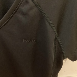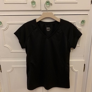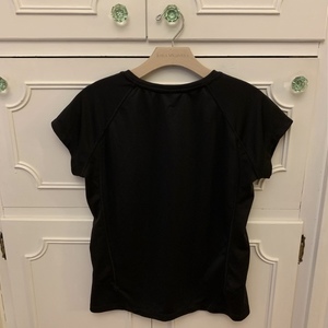 Solid black athletic t short, short sleeves, v neck, stretchy. Measurements Pit to pit: 18.5 in Length: 23.5 in