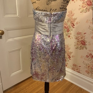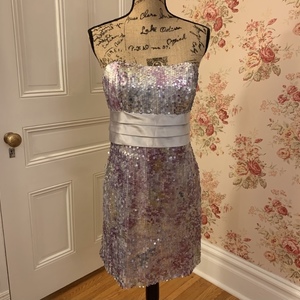 beautiful purple cocktail party dress, lilac color. Strapless, very sparkly sequins. Great for prom, homecoming, a wedding, or as a bridesmaid dress! Measurements Pit to pit: 16.5 in Length: 28 in