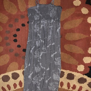 A nice dress for spring/summer! Varying colors of grey with floral patterning. This dress is in good condition, but naturally has a sort of aged/handmade look to it.