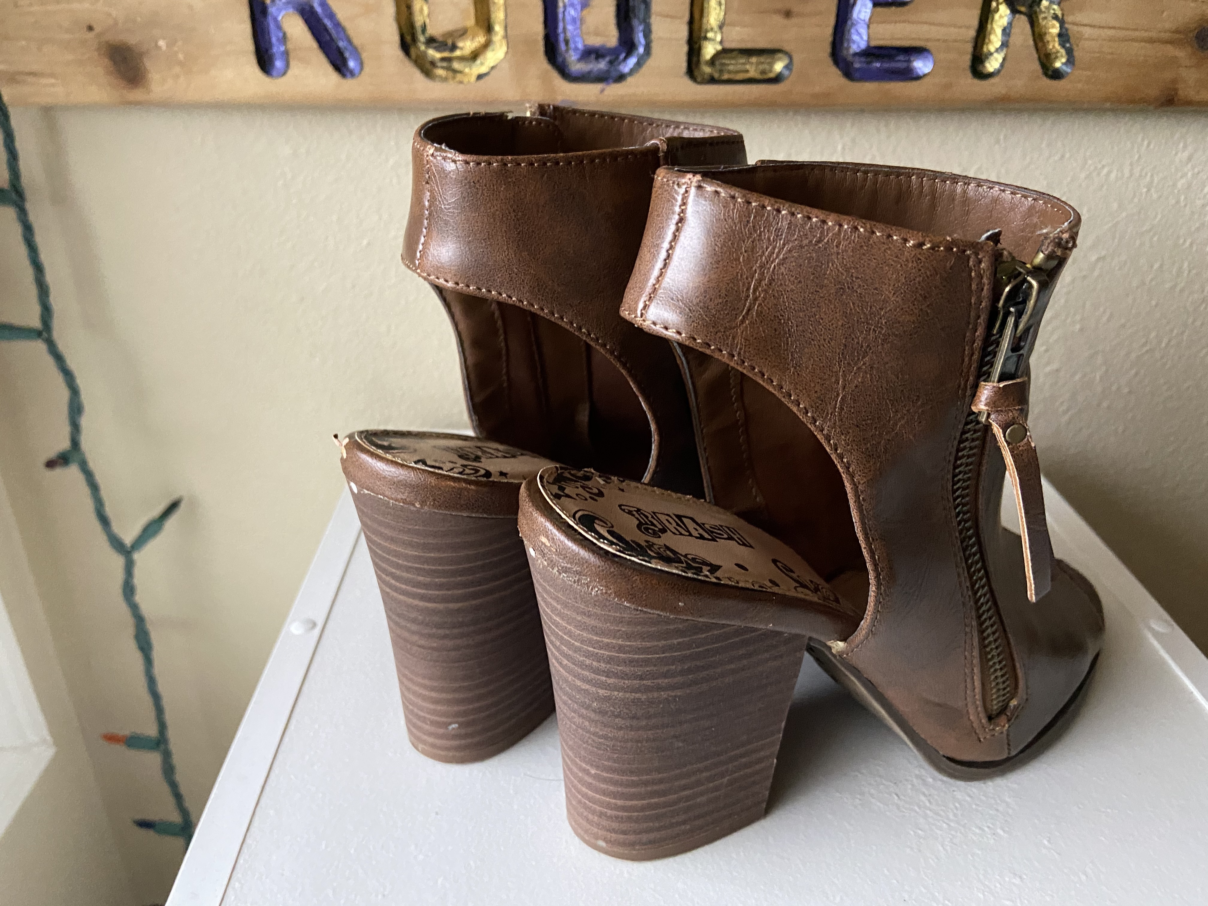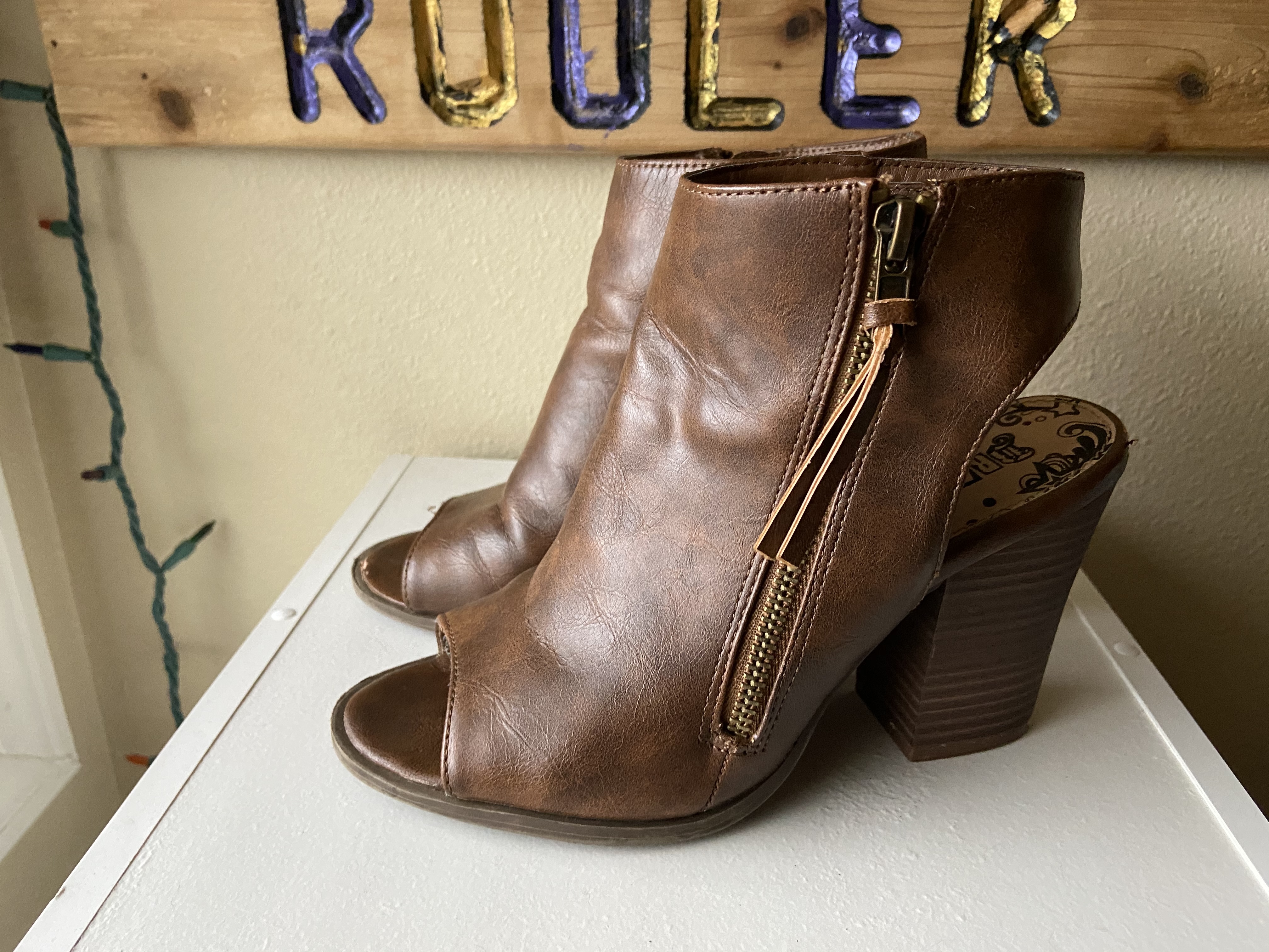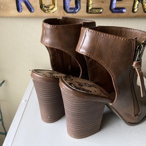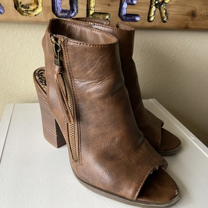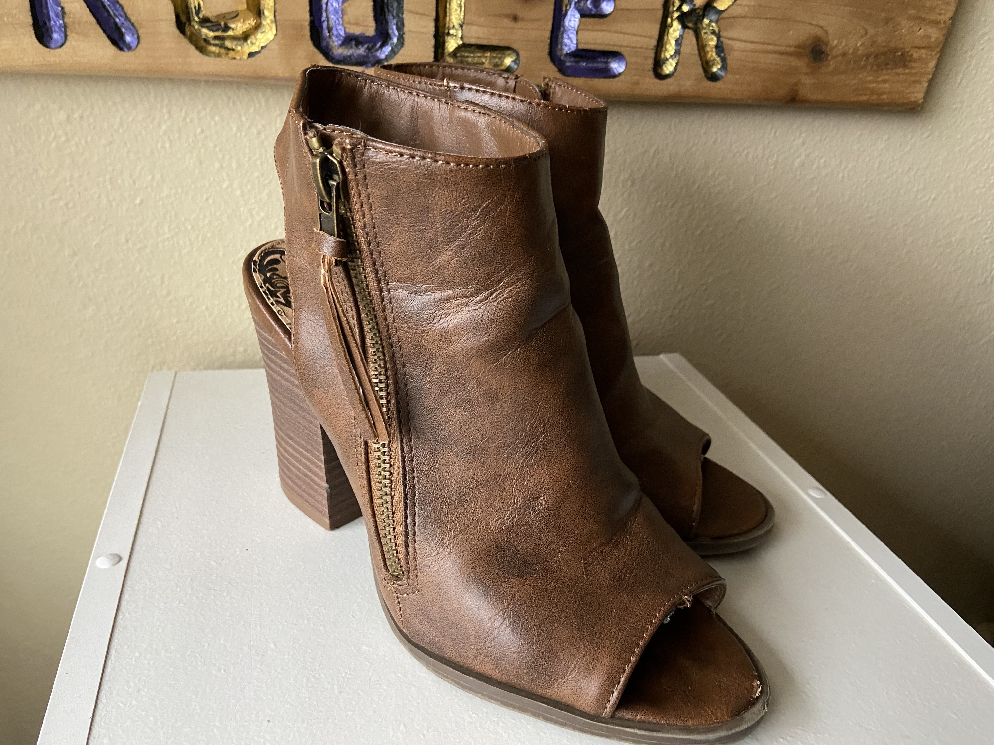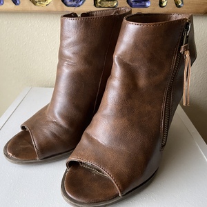 Super cute zip up peep toe and open heel heels. These have been worn a few times so there is some creasing and wear and tear which I will add in the photos.