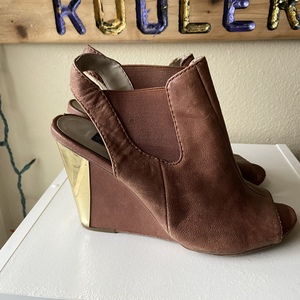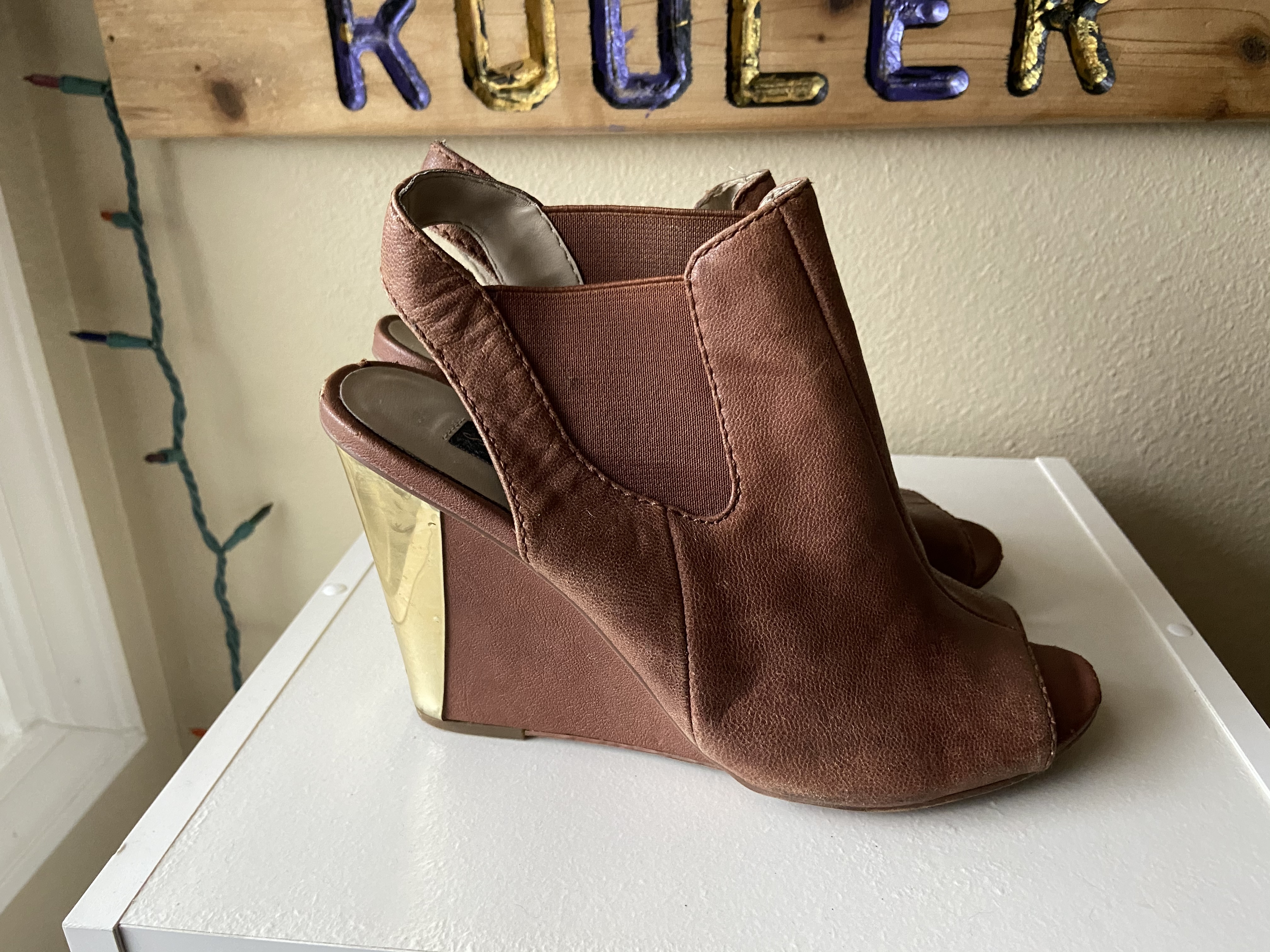 Super cute Steve Madden wedges with gold plates on the back. Not sure if it’s real leather. Has some wear/tear pictured below. One of the shoes has a dark colored smudge. Not sure what it is but could probably be cleaned off.