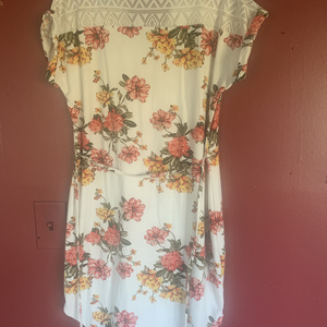 Super cute has flower detailing. With a cute tie belt and lace at the shoulders.