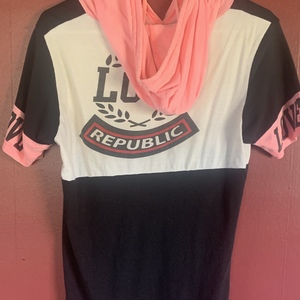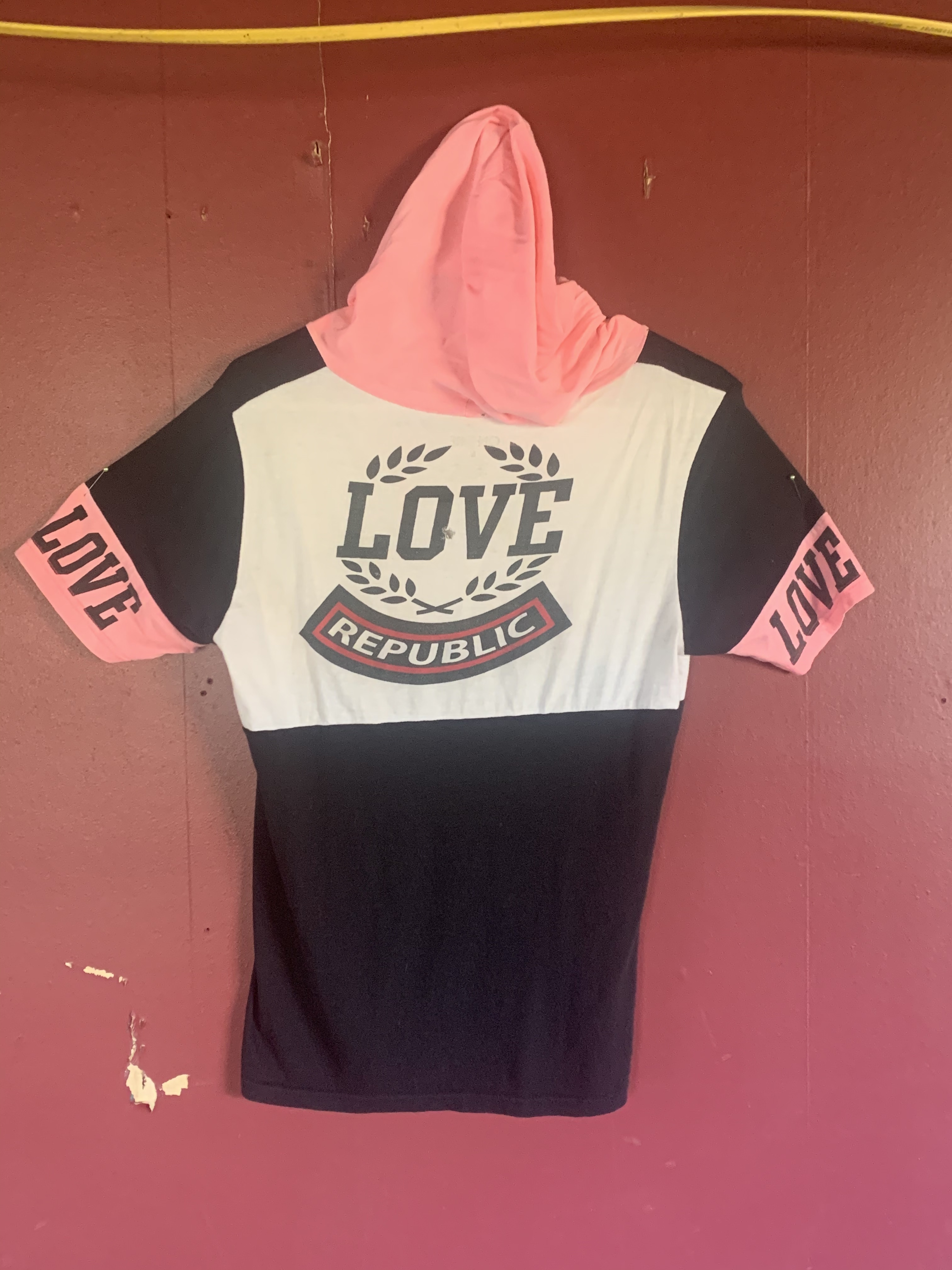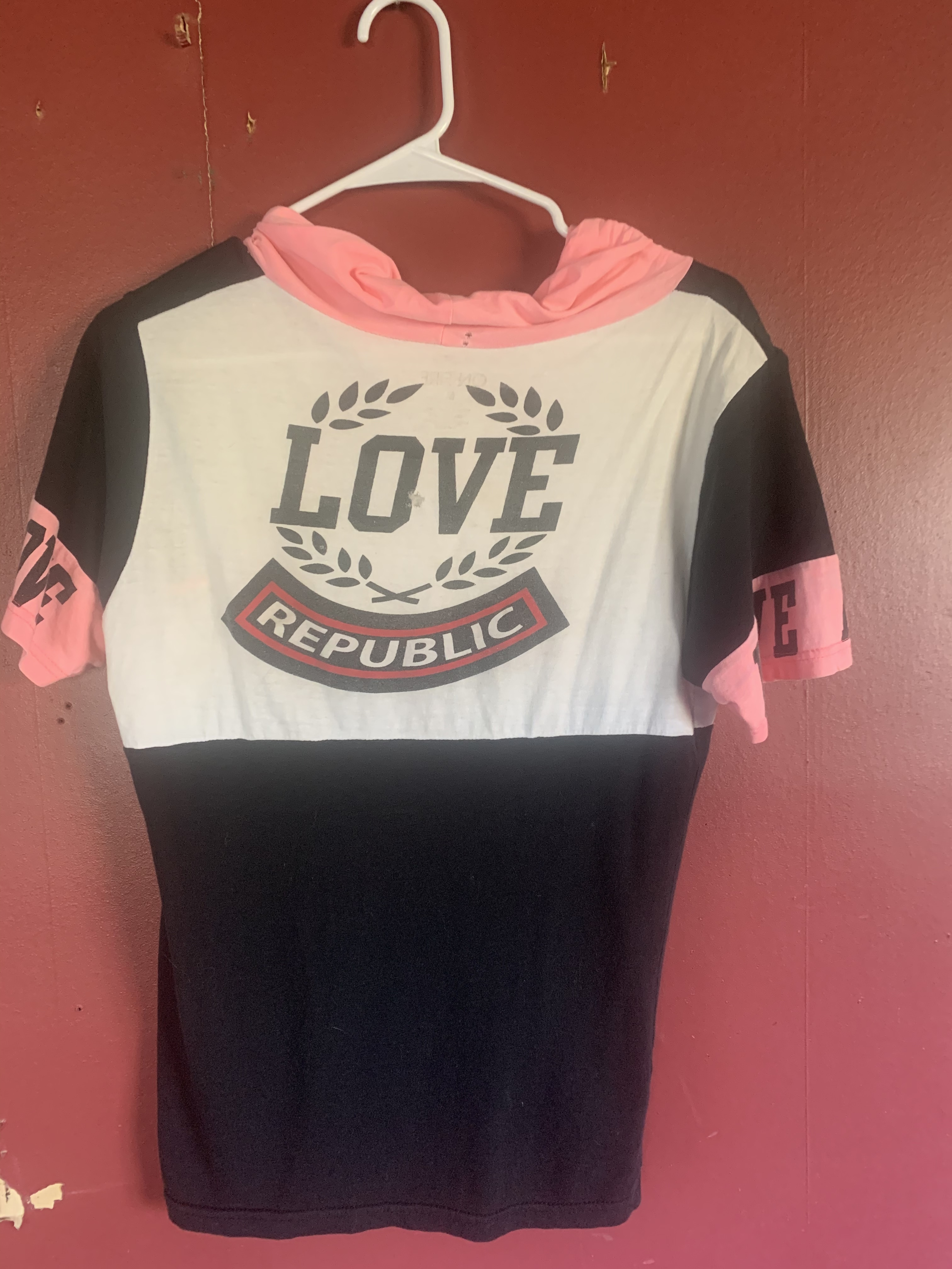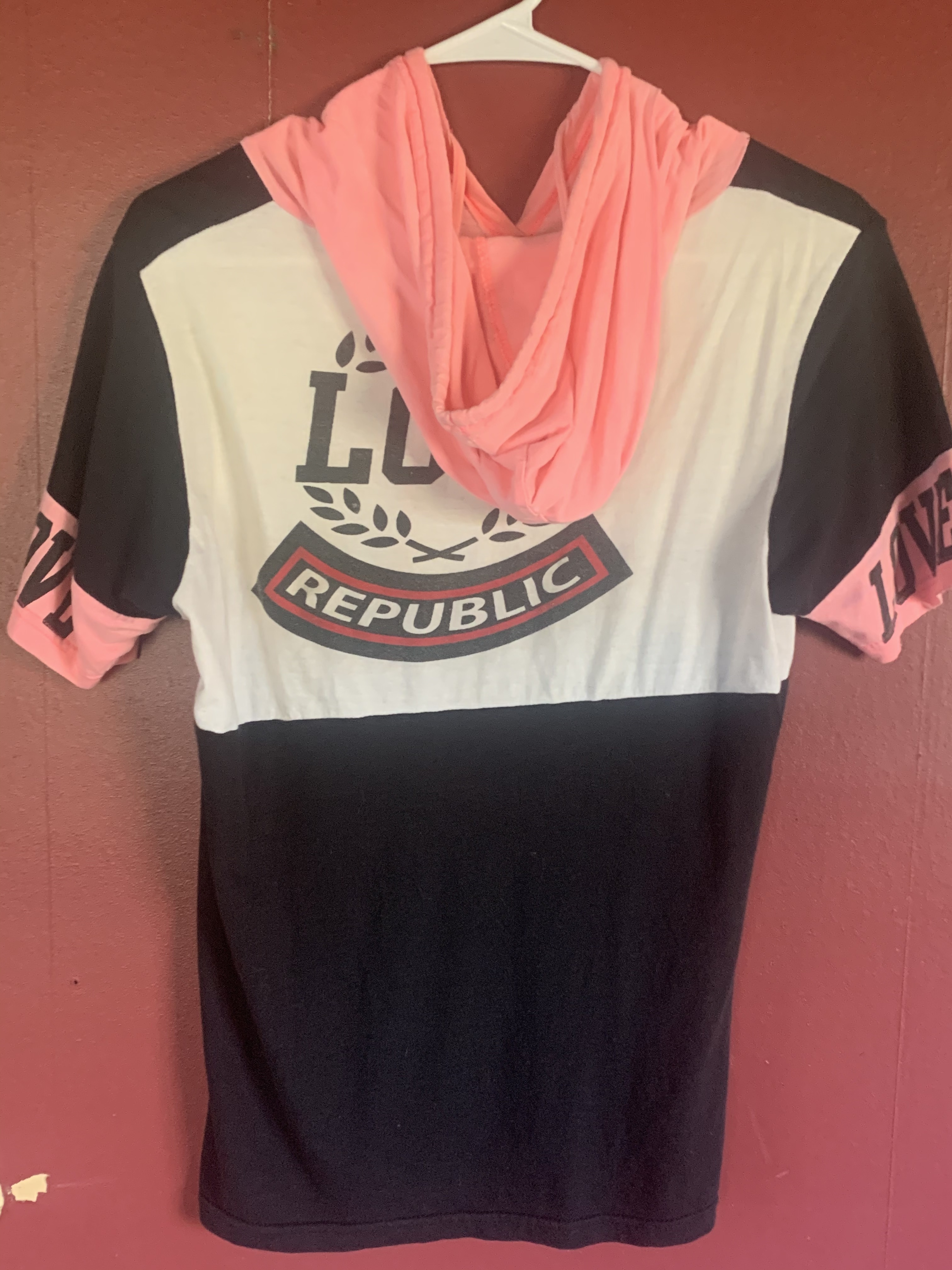 Trendy love republic shirt black white and pink with love wording on the shoulder and front and back