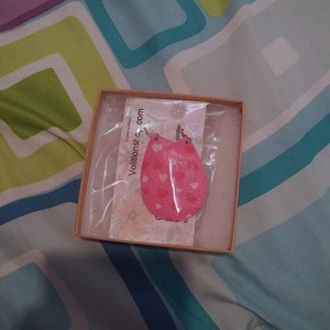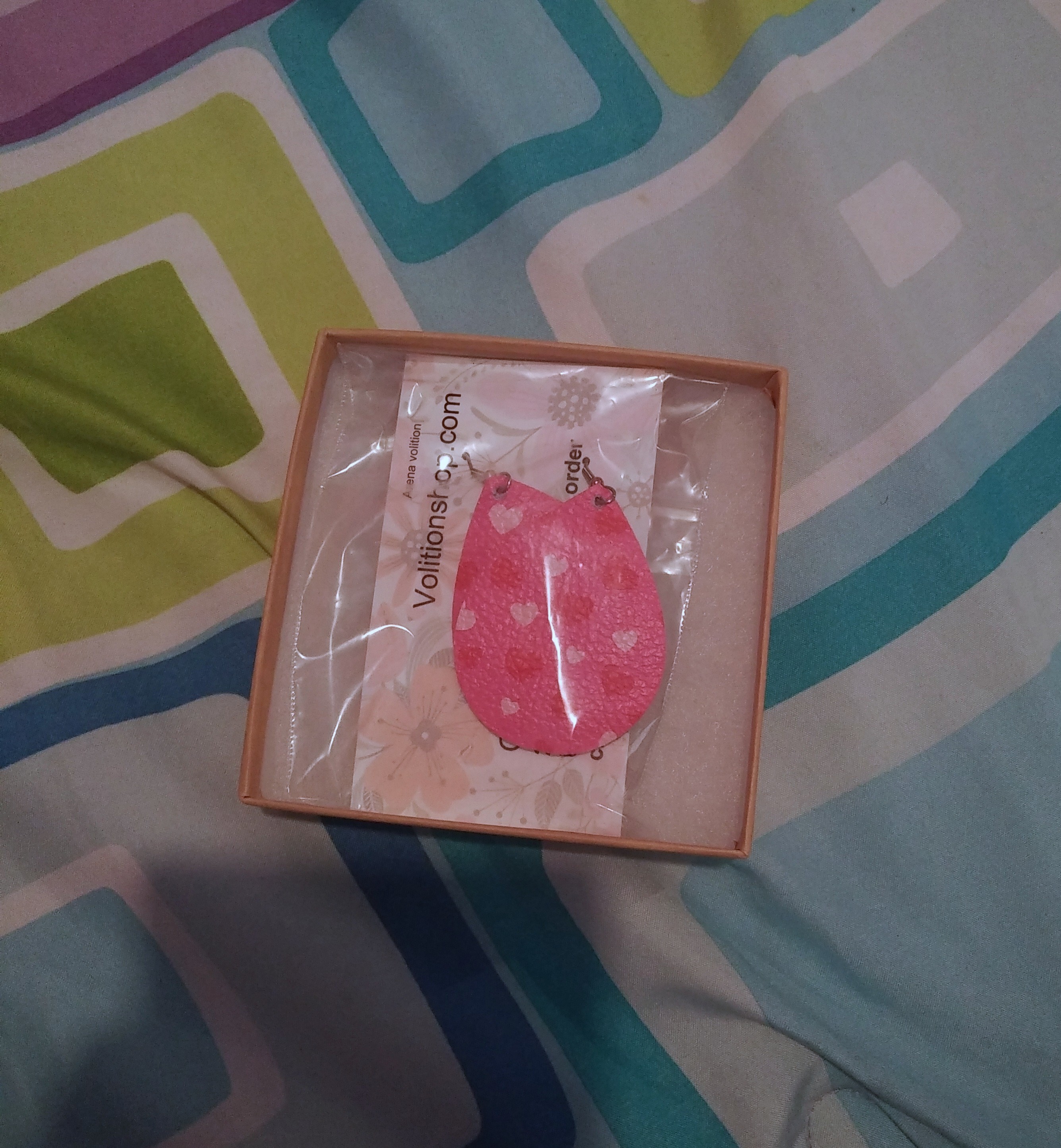 tear shaped earrings with a pink and red heart pattern. Unworn.