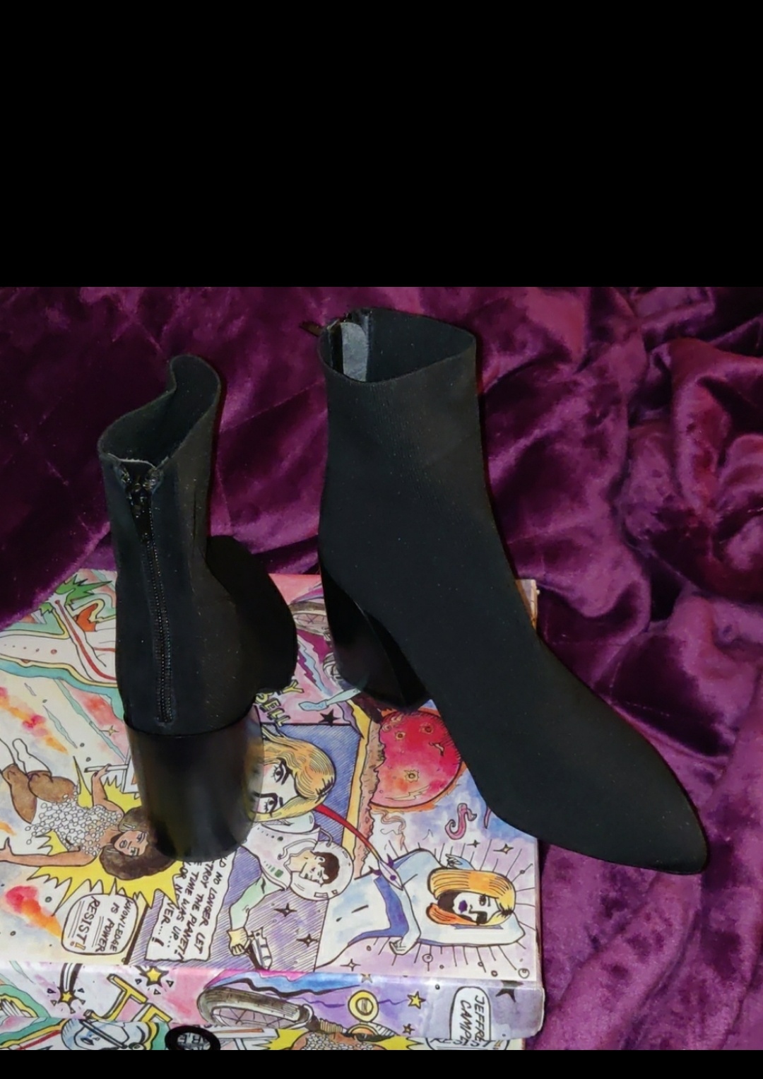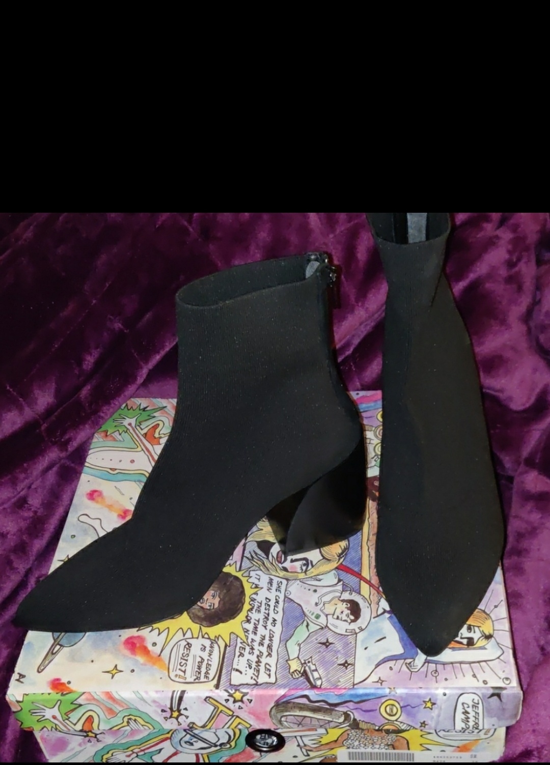 Bentlee Bootie in Black Stretch knit upper with man made sole Leather lining Back zipper closure with suede trim Curved heel Heel measures approx 3" H Shaft measures approx 4.5" H These are brand new never worn I paid $175 for them.