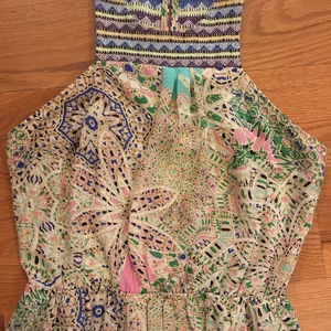 Long summery dress with short slip underneath and modest slit on one leg. Woven detail and cut at top makes for unique silhouette of dress. Light and comfy with a pretty pattern makes it perfect for a dressy casual occasion in warm seasons or on a tropical vacation.