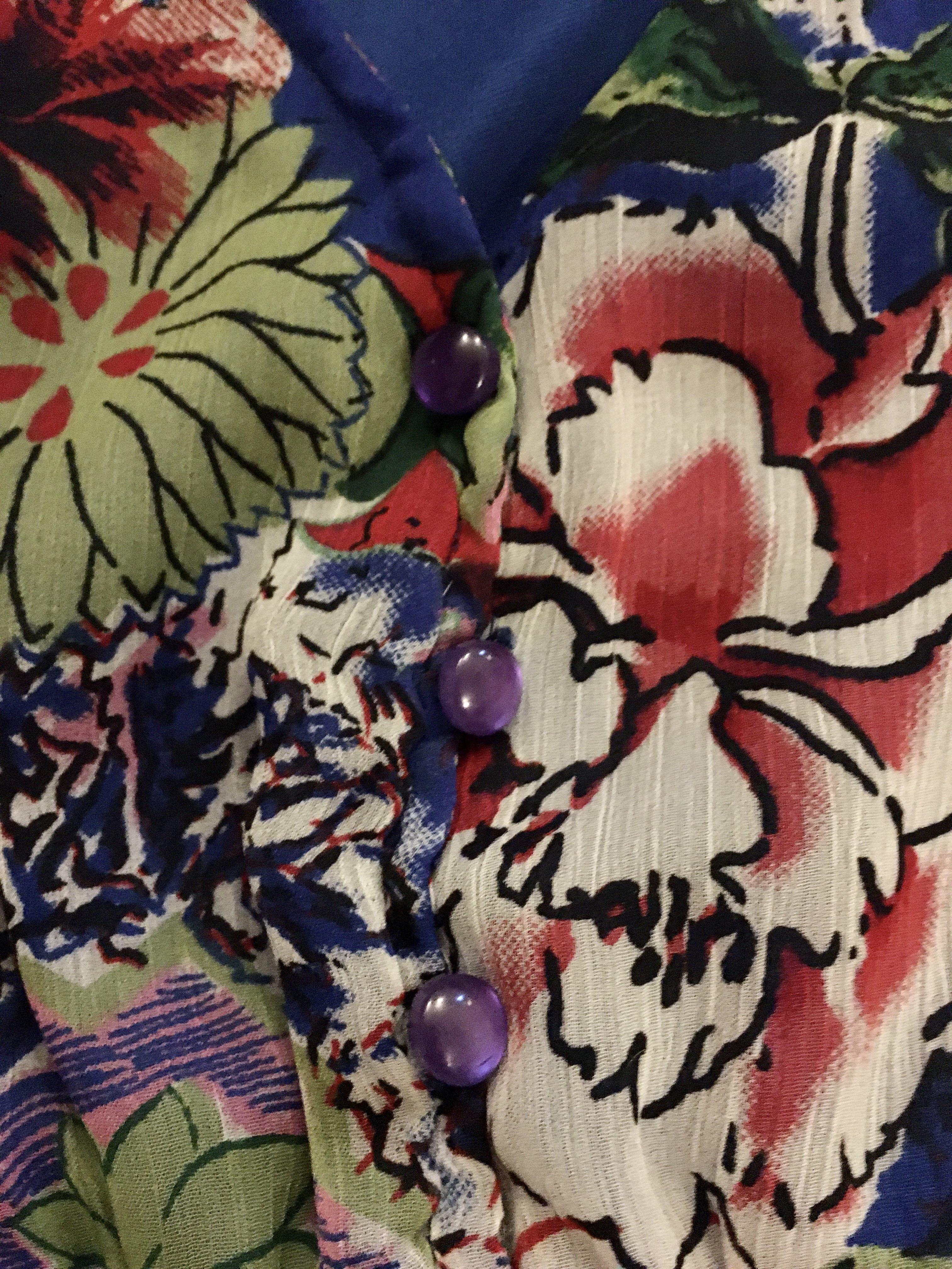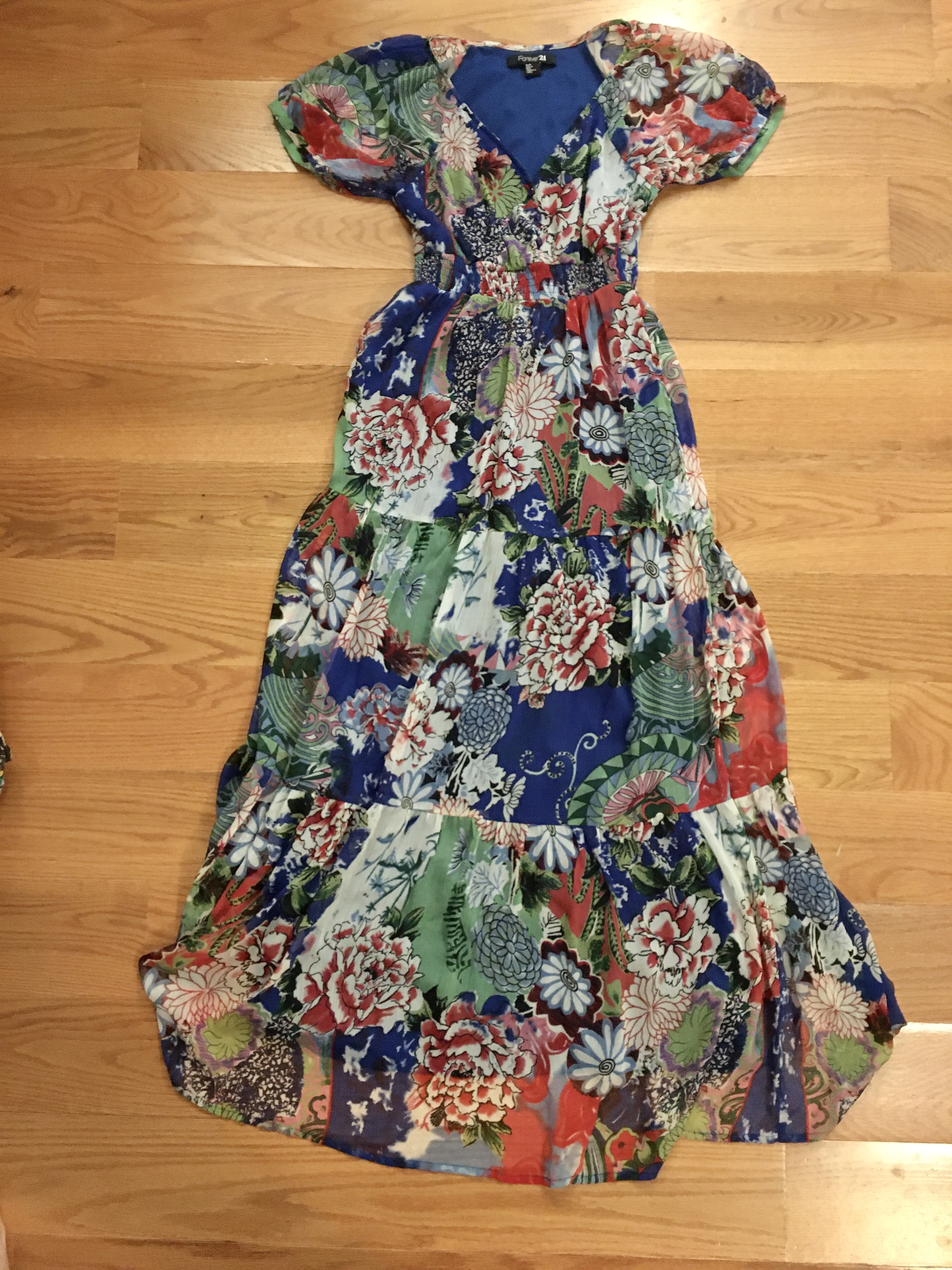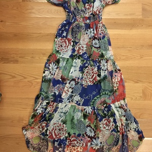 Long, super flowy cap-sleeved dress with layered skirt and lots of character. Delicate sleeves, V-neck and petite buttons give this dress sweet touches.