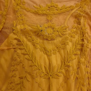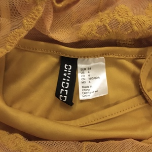 Mustard colored pretty overlay dress. Hits mid-thigh on this 5’6” height 115 lb gal. Has separate yellow slip underneath. Dress up or causal, cute look worn with leggings.