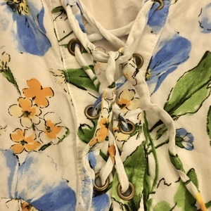 Short dress with layered skirt and lace-tie top. Slim fit and waist and slightly flared skirt. Adorable as a beach cover-up or on its own.