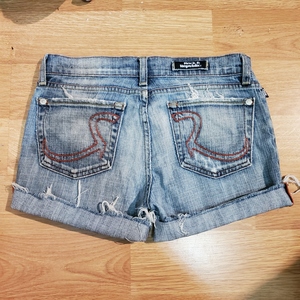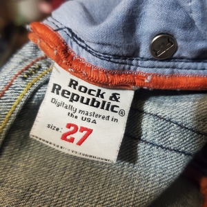 This is a pair of Rock & Republic Jeans That were cut in to shorts. These have some manufacturer distressing . But These are still in good condition.. I will do my best to show pictures all of them. Across the waist ~ 15" . . . ... Inseam ~ 4" (un rolled) . . . Rise ~ 7.5" . . . . Leg opening ~ 9.5"... ... . . . Hips ~ 19.5 - 20". . .