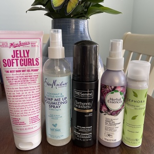 Sephora dry shampoo new sealed container Herbal Essences spray gel about 1/3 or little more left TRESemme between washes styling foam almost full Shea Moisture pump me up volumizing spray used couple times only Miss Jessie’s Jelly soft curls Gel used 2 times only